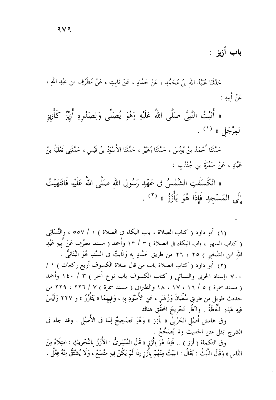 حَدَّثَنَا عُبَيْدُ اللَّهِ بْنُ مُحَمَّدٍ، عَنْ حَمَّادٍ، عَنْ ثَابِتٍ، عَنْ مُطَرِّفِ بْنِ عَبْدِ اللَّهِ، عَنْ أَبِيهِ: أَتَيْتُ النَّبِيَّ صَلَّى اللَّهُ عَلَيْهِ وَهُوَ يُصَلِّي، §وَلِصَدْرِهِ أَزِيزٌ كَأَزِيزِ الْمِرْجَلِ "