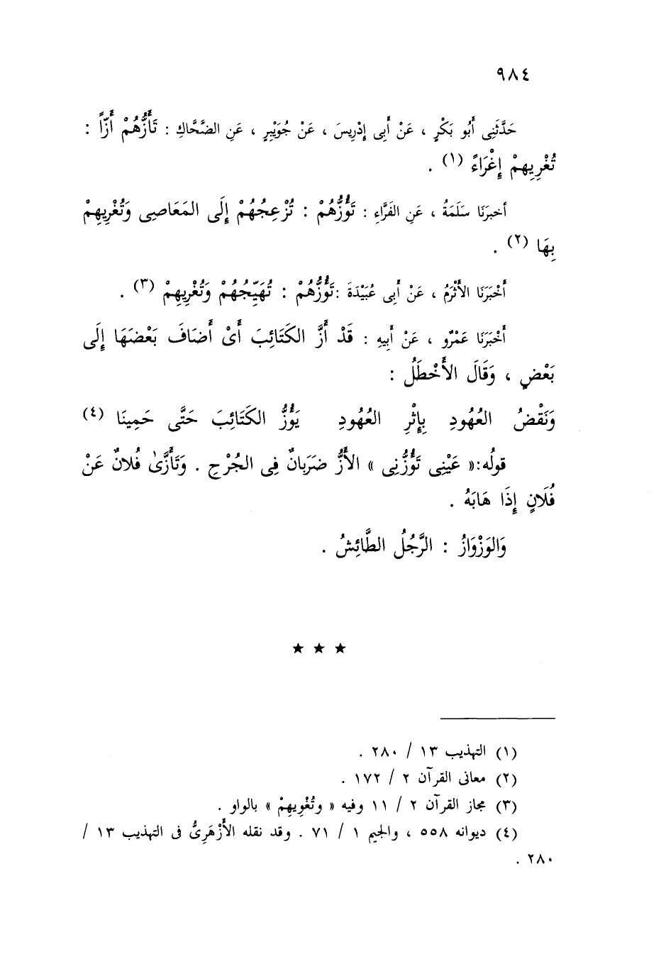 حَدَّثَنِي أَبُو بَكْرٍ، عَنْ أَبِي إِدْرِيسَ، عَنْ جُوَيْبِرٍ، عَنِ الضَّحَّاكِ: " §تَؤُزُّهُمْ أَزًّا: تُغْرِيهِمْ إِغْرَاءً " أَخْبَرَنَا سَلَمَةُ، عَنِ الْفَرَّاءِ: تَؤُزُّهُمْ: تُزْعِجُهُمْ إِلَى الْمَعَاصِي، وَتُغْرِيهِمْ بِهَا أَخْبَرَنَا الْأَثْرَمُ، عَنْ أَبِي عُبَيْدَةَ: تَؤُزُّهُمْ: تُهَيِّجُهُمْ وَتُغْرِيهِمْ أَخْبَرَنَا عَمْرٌو، عَنْ أَبِيهِ: قَدْ أَزَّ الْكَتَائِبَ أَيْ أَضَافَ بَعْضَهَا إِلَى بَعْضٍ وَقَالَ الْأَخْطَلُ: