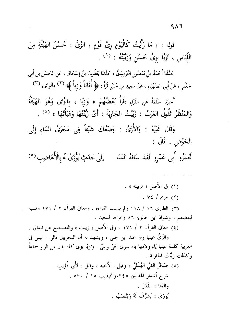 حَدَّثَنَا أَحْمَدُ بْنُ مَنْصُورٍ التِّرْمِذِيُّ، حَدَّثَنَا يَعْقُوبُ بْنُ إِسْحَاقَ، عَنِ الْحَسَنِ بْنِ أَبِي جَعْفَرٍ، عَنْ أَبِي الصَّهْبَاءِ، عَنْ سَعِيدِ بْنِ جُبَيْرٍ، §قَرَأَ: (أَثَاثًا وَزِيًّا) بِالزَّايِ " أَخْبَرَنَا سَلَمَةُ، عَنِ الْفَرَّاءِ: قَرَأَ بَعْضُهُمْ: (وَزِيًّا) ، بِالزَّايِ، وَهُوَ الْهَيْئَةُ وَالْمَنْظَرُ، تَقُولُ الْعَرَبُ: زَيَّيْتُ الْجَارِيَةَ: أَيْ زَيَّنْتُهَا وَهَيَّأْتُهَا وَقَالَ غَيْرُهُ: وَالْأَزْيُ: وَضْعُكَ شَيْئًا فِي مَجْرَى الْمَاءِ إِلَى الْحَوْضِ قَالَ: