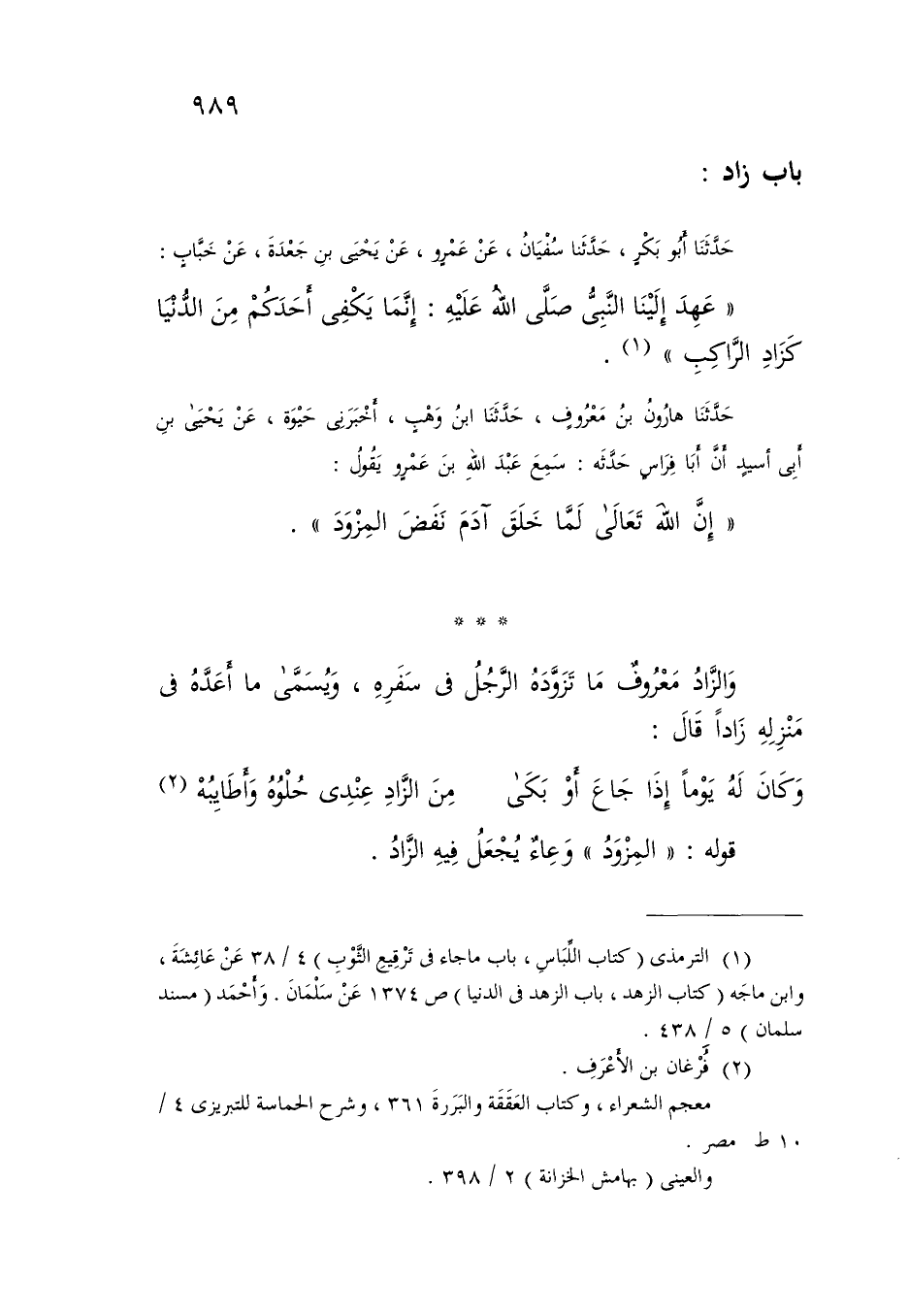 حَدَّثَنَا هَارُونُ بْنُ مَعْرُوفٍ، حَدَّثَنَا ابْنُ وَهْبٍ، أَخْبَرَنِي حَيْوَةُ، عَنْ يَحْيَى بْنِ أَبِي الْأُسَيْدِ، أَنَّ أَبَا فِرَاسٍ، حَدَّثَهُ، سَمِعَ عَبْدَ اللَّهِ بْنَ عَمْرٍو يَقُولُ: «§إِنَّ اللَّهَ تَعَالَى لَمَّا خَلَقَ آدَمَ نَفَضَ الْمِزْوَدَ» وَالزَّادُ مَعْرُوفٌ: مَا تَزَوَّدَهُ الرَّجُلُ فِي سَفَرِهِ، وَيُسَمَّى مَا أَعَدَّهُ فِي مَنْزِلِهِ زَادًا، قَالَ: