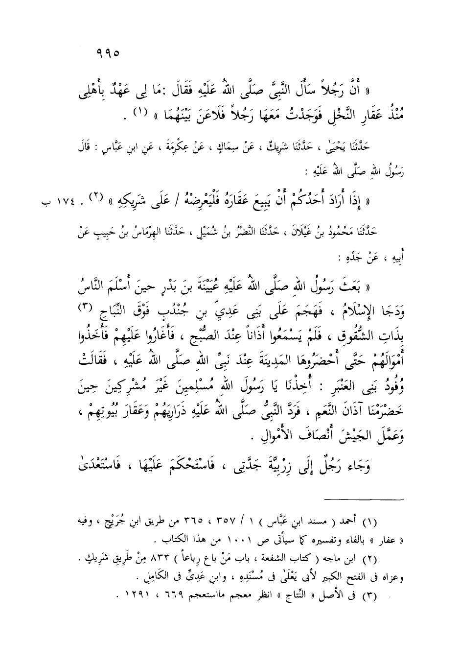 حَدَّثَنَا مَحْمُودُ بْنُ غَيْلَانَ، حَدَّثَنَا النَّصْرُ بْنُ شُمَيْلٍ، حَدَّثَنَا الْهِرْمَاسُ بْنُ حَبِيبٍ، عَنْ أَبِيهِ، عَنْ جَدِّهِ: بَعَثَ رَسُولُ اللَّهِ صَلَّى اللَّهُ عَلَيْهِ عُيَيْنَةَ بْنَ بَدْرٍ حِينَ أَسْلَمَ النَّاسُ وَدَجَا الْإِسْلَامُ، فَهَجَمَ عَلَى بَنِي عَدِيِّ بْنِ جُنْدُبٍ فَوْقَ النِّبَاحِ بِذَاتِ الشُّقُوقِ، فَلَمْ يَسْمَعُوا أَذَانًا عِنْدَ الصُّبْحِ، فَأَغَارُوا عَلَيْهِمْ، فَأَخَذُوا أَمْوَالَهُمْ حَتَّى أَحْضَرُوهَا الْمَدِينَةَ عِنْدَ نَبِيِّ اللَّهِ صَلَّى اللَّهُ عَلَيْهِ، فَقَالَتْ وُفُودُ بَنِي الْعَنْبَرِ: أُخِذْنَا يَا رَسُولَ اللَّهِ مُسْلِمَيْنِ غَيْرَ مُشْرِكِينَ حِينَ خَضْرَمْنَا آذَانَ النَّعَمِ، §فَرَدَّ رَسُولُ اللَّهِ صَلَّى اللَّهُ عَلَيْهِ ذَرَارِيَّهُمْ وَعَقَارَ بُيُوتِهِمْ، وَعَمَّلَ الْجَيْشَ أَنْصَافَ الْأَمْوَالِ وَجَاءَ رَجُلٌ إِلَى زِرْبِيَّةَ جَدَّتِي، فَاسْتَحْكَمَ عَلَيْهَا، فَاسْتَعْدَى -[996]- رَسُولُ اللَّهِ، فَقَالَ: «الْزَمْهُ» ، وَإِنَّهُ مَرَّ بِهِ وَهُوَ مَعَهُ فَقَالَ: «مَا تُرِيدُ أَنْ تَفْعَلَ بِأَسِيرِكَ يَا أَخَا بَنِي الْعَنْبَرِ؟»