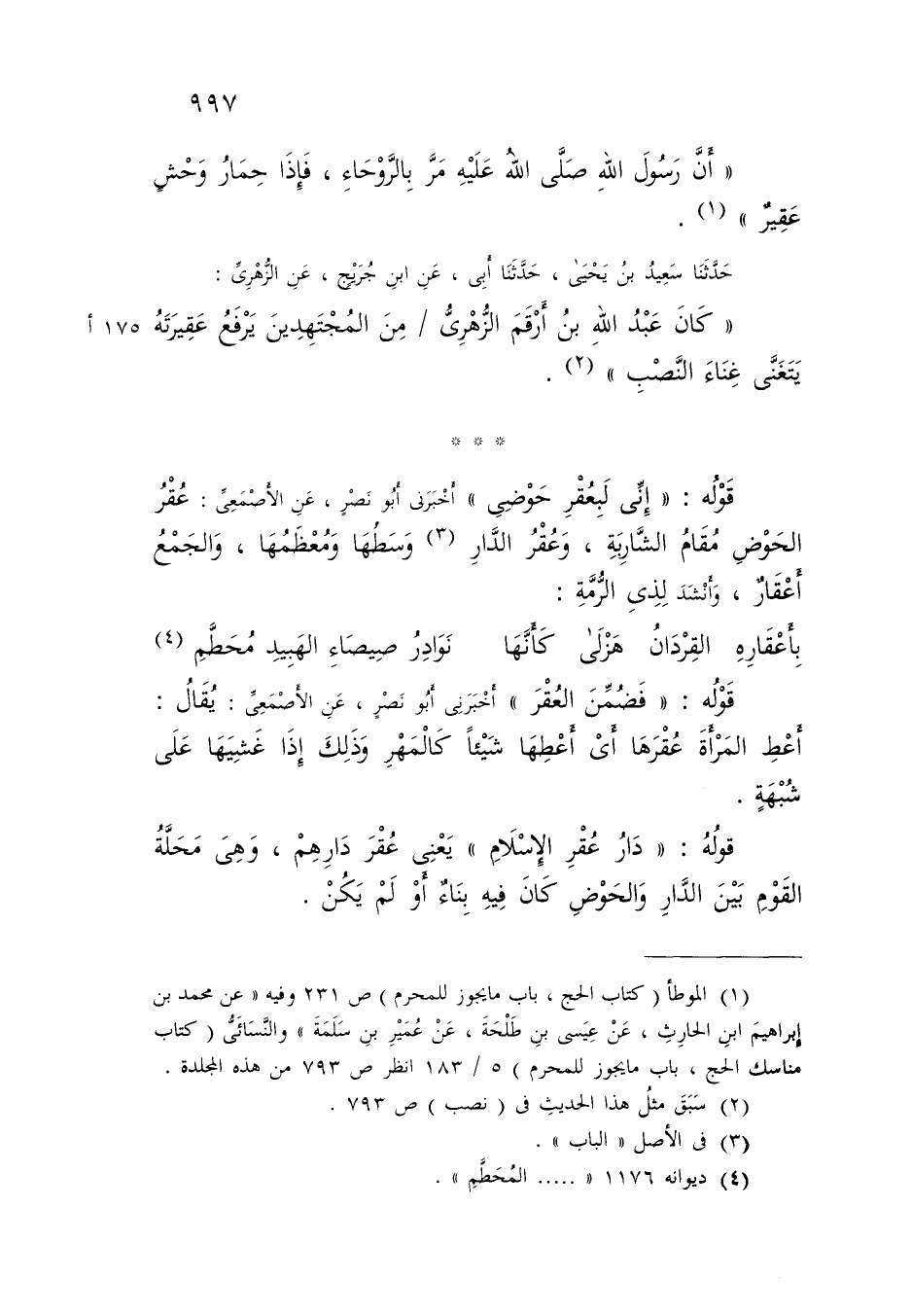 حَدَّثَنَا سَعِيدُ بْنُ يَحْيَى، حَدَّثَنَا أَبِي، عَنِ ابْنِ جُرَيْجٍ، عَنِ الزُّهْرِيِّ: «كَانَ عَبْدُ اللَّهِ بْنُ أَرْقَمَ الزُّهْرِيُّ مِنَ الْمُجْتَهِدِينَ §يَرْفَعُ عَقِيرَتَهُ يَتَغَنَّى غِنَاءَ النَّصْبِ» قَوْلُهُ: «إِنِّي لَبِعُقْرِ حَوْضِي» أَخْبَرَنِي أَبُو نَصْرٍ، عَنِ الْأَصْمَعِيِّ: عُقْرُ الْحَوْضِ مَقَامُ الشَّارِبَةِ، وَعُقْرُ الدَّارِ، وَسَطُهَا وَمُعْظَمُهَا، وَالْجَمْعُ أَعْقَارٌ، وَأَنْشَدَ لِذِي الرُّمَّةِ: