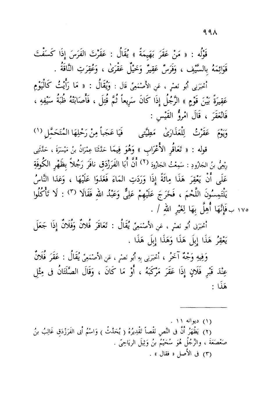 حَدَّثَنَا عِمْرَانُ بْنُ مَيْسَرَةَ، حَدَّثَنِي رِبْعِيُّ بْنُ الْجَارُودِ، سَمِعْتُ الْجَارُودَ، أَنَّ أَبَا الْفَرَزْدَقِ نَافَرَ رَجُلًا بِظَهْرِ الْكُوفَةِ عَلَى أَنْ يَعْقِرَ هَذَا مِائَةً إِذَا وَرَدَتِ الْمَاءَ، فَغَدَوَا عَلَيْهَا، وَغَدَا النَّاسُ يَلْتَمِسُونَ اللَّحْمَ، فَخَرَجَ عَلَيْهِمْ عَلِيٌّ وَعَبْدُ اللَّهِ فَقَالَا: «§لَا تَأْكُلُوا؛ فَإِنَّهَا أُهِلَّ بِهَا لِغَيْرِ اللَّهِ» أَخْبَرَنَا أَبُو نَصْرٍ، عَنِ الْأَصْمَعِيِّ: يُقَالُ: تَعَاقَرَ فُلَانٌ وَفُلَانٌ، إِذَا جَعَلَ يَعْقِرُ هَذَا إِبِلَ هَذَا، وَهَذَا إِبِلَ هَذَا وَفِيهِ وَجْهٌ آخَرُ أَخْبَرَنِي بِهِ أَبُو نَصْرٍ، عَنِ الْأَصْمَعِيِّ: يُقَالُ: عَقَرَ فُلَانٌ عِنْدَ قَبْرِ فُلَانٍ، إِذَا عَقَرَ مَرْكَبَهُ، أَوْ مَا كَانَ، وَقَالَ الصَّلَتَانُ فِي مِثْلِ هَذَا: