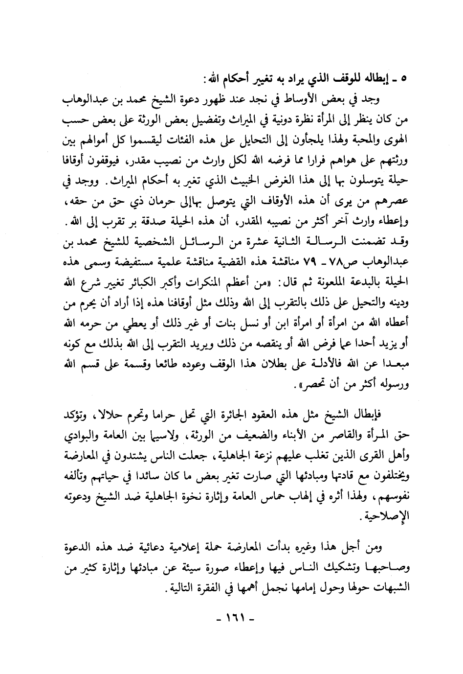 وجد في بعض الأوساط في نجد عند ظهور دعوة الشيخ محمد بن عبد الوهاب من كان ينظر إلى المرأة نظرة دنيوية في الميراث وتفضيل بعض الورثة على بعض حسب الهوى والمحبة ولهذا يلجأون إلى التحايل على هذه الفئات ليقسموا كل أموالهم بين ورثتهم على هواهم فرارا مما فرضه الله لكل وارث من نصيب مقدر، فيوقفون أوقافا حيلة يتوسلون بها إلى هذه الغرض الخبيث الذي تغير به أحكام الميراث، ووجد في عصرهم من يرى أن هذه الأوقاف التي يتوسل بها إلى حرمان ذي حق من حقه، وإعطاء وارث آخر أكثر من نصيبه المقدر، أن هذه الحيلة صدقة بر تقرب إلى الله. وقد تضمنت الرسالة الثانية عشرة من الرسائل الشخصية للشيخ محمد بن عبد الوهاب ص 78-79 مناقشة هذه القضية مناقشة علمية مستفيضة وسمى هذه الحيلة بالبدعة الملعونة ثم قال:"من أعظم المنكرات وأكبر الكبائر تغيير شرع الله ودينه والتحيل على ذلك بالتقرب إلى الله وذلك مثل أوقافنا هذه إذا أراد أن يحرم من أعطاه الله من امرأة أو امرأة ابن أو نسل بناة أو غير ذلك أو يعطي من حرمه الله أو يزيد أحدا عما فرض الله أو ينقصه من ذلك ويريد التقرب إلى الله بذلك مع كونه مبعدا عن الله فالأدلة على بطلان هذا الوقف وعوده طائعا وقسمة على قسم الله ورسوله أكثر من أن تحصر".