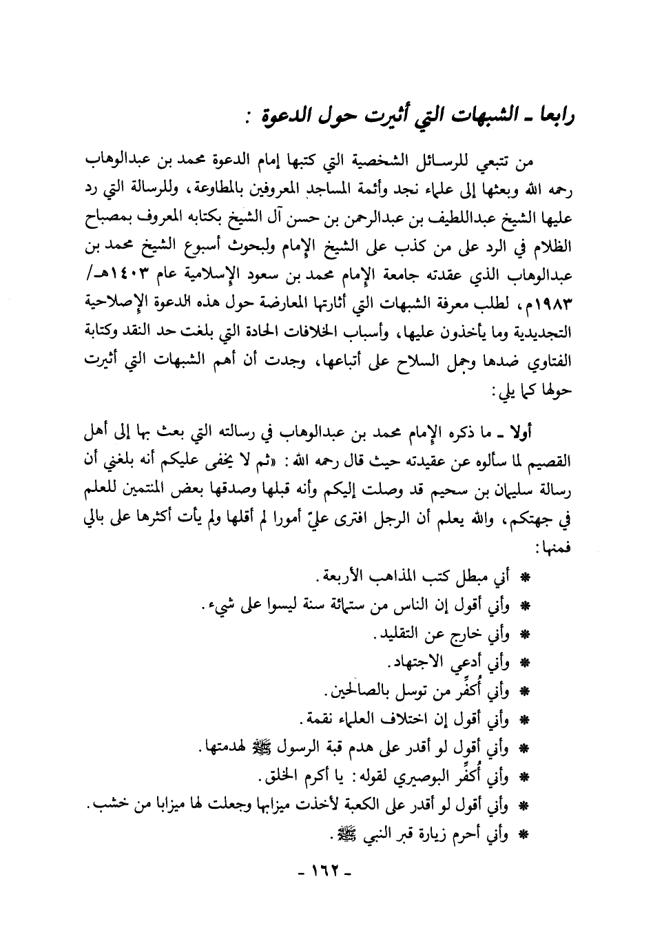 من تتبعي للرسائل الشخصية التي كتبها إمام الدعوة محمد بن عبد الوهاب رحمه الله وبعثها إلى علماء نجد وأئمة المساجد المعروفين بالمطاوعة، وللرسالة التي رد عليها الشيخ عبد اللطيف بن عبد الرحمن بن حسن آل الشيخ بكتابه المعروف بمصباح الظلام في الرد على من كذب على الشيخ الإمام ولبحوث أسبوع الشيخ محمد بن عبد الوهاب الذي عقدته جامعة الإمام محمد بن سعود الإسلامية عام 1403هـ /