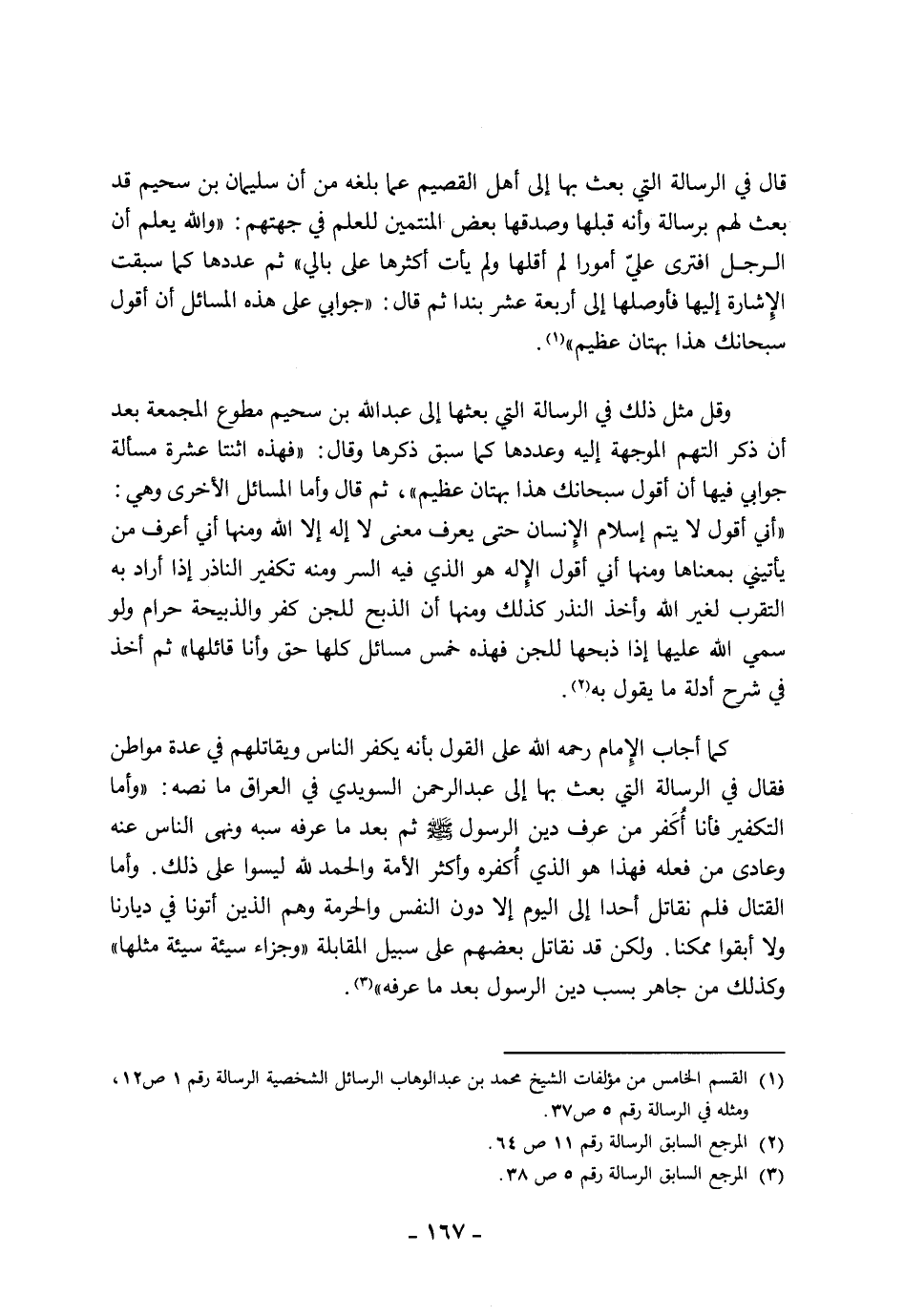 1 القسم الخامس من مؤلفات الشيخ محمد بن عبد الوهاب الرسائل الشخصية الرسالة رقم 1ص 12، ومثله في الرسالة رقم 5 ص 37.