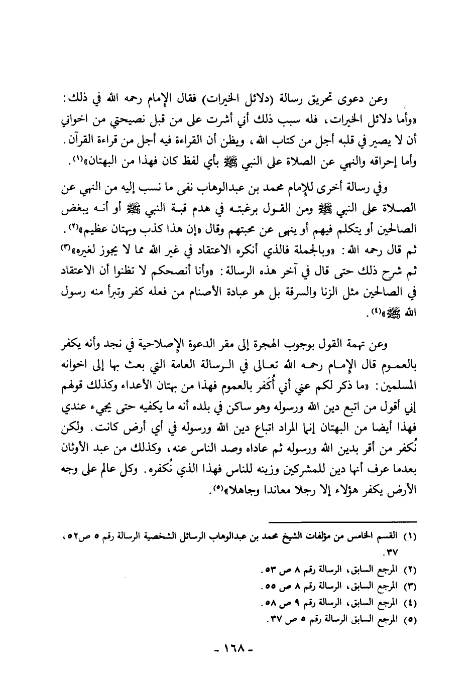 1 القسم الخامس من مؤلفات الشيخ محمد بن عبد الوهاب الرسائل الشخصية الرسالة رقم5 ص 52، 37.
