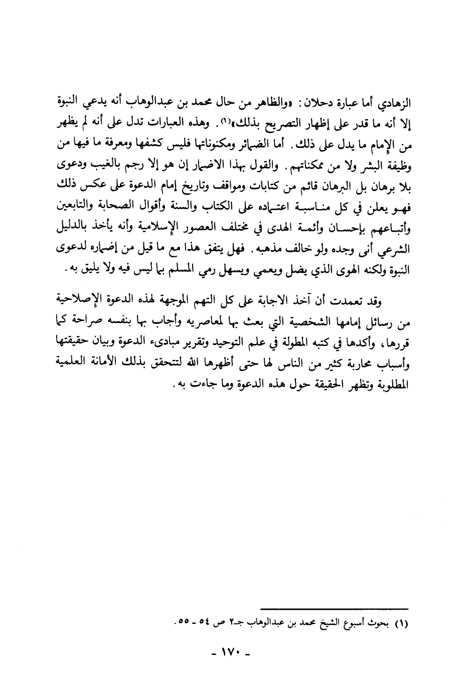 الزهادي أما عبارة دحلان:"والظاهر من حال محمد بن عبد الوهاب أنه يدعي النبوة إلا أنه ما قدر على إظهار التصريح بذلك "1 وهذه العبارات تدل على أنه لم يظهر من الإمام ما يدل على ذلك. أما الضمائر ومكنوناتها فليس كشفها ومعرفة ما فيها من وظيفة البشر ولا من ممكناتهم. والقول بهذا الإضمار إن هو إلا رجما بالغيب ودعوى بلا برهان بل البرهان قائم من كتابات ومواقف وتاريخ إمام الدعوة على عكس ذلك فهو يعلن في كل مناسبة اعتماده على الكتاب والسنة وأقوال الصحابة والتابعين وأتباعهم بإحسان وأئمة الهدى في مختلف العصور الإسلامية وأنه يأخذ بالدليل الشرعي أنى وجده ولو خالف مذهبه. فهل يتفق هذا مع ما قيل من إضماره لدعوى النبوة ولكنه الهوى الذي يضل ويعمى ويسهل رمي المسلم بما ليس فيه ولا يليق به.
