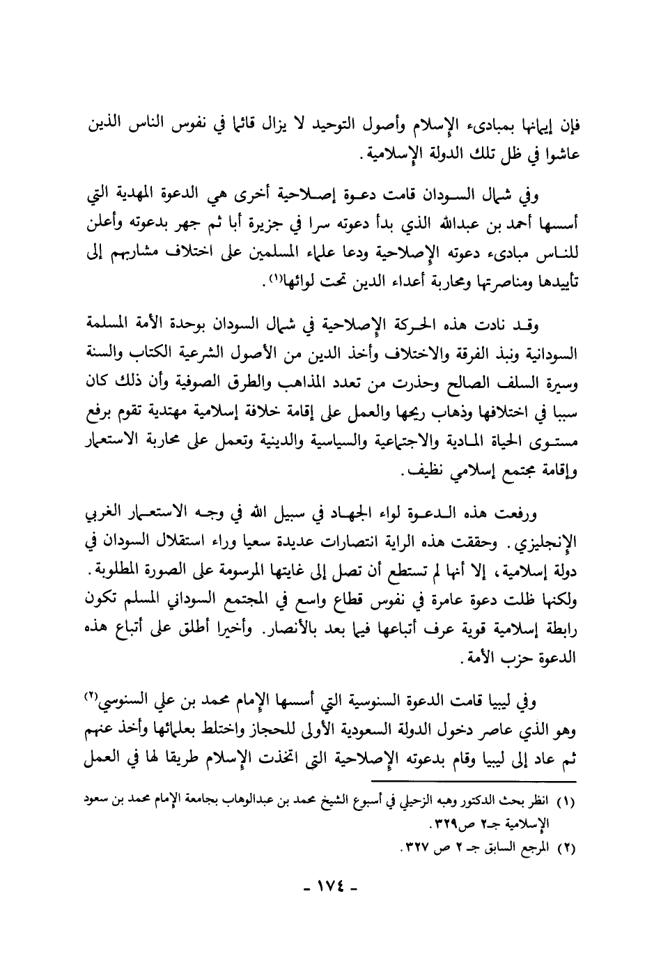وفي ليبيا قامت الدعوة السنوية التي أسسها الإمام محمد بن علي السنوسي 2وهو الذي عاصر دخول الدولة السعودية الأولى للحجاز واختلط بعلمائها وأخذ عنهم ثم عاد إلى ليبيا وقام بدعوته الإصلاحية التي اتخذت الإسلام طريقا لها في العمل