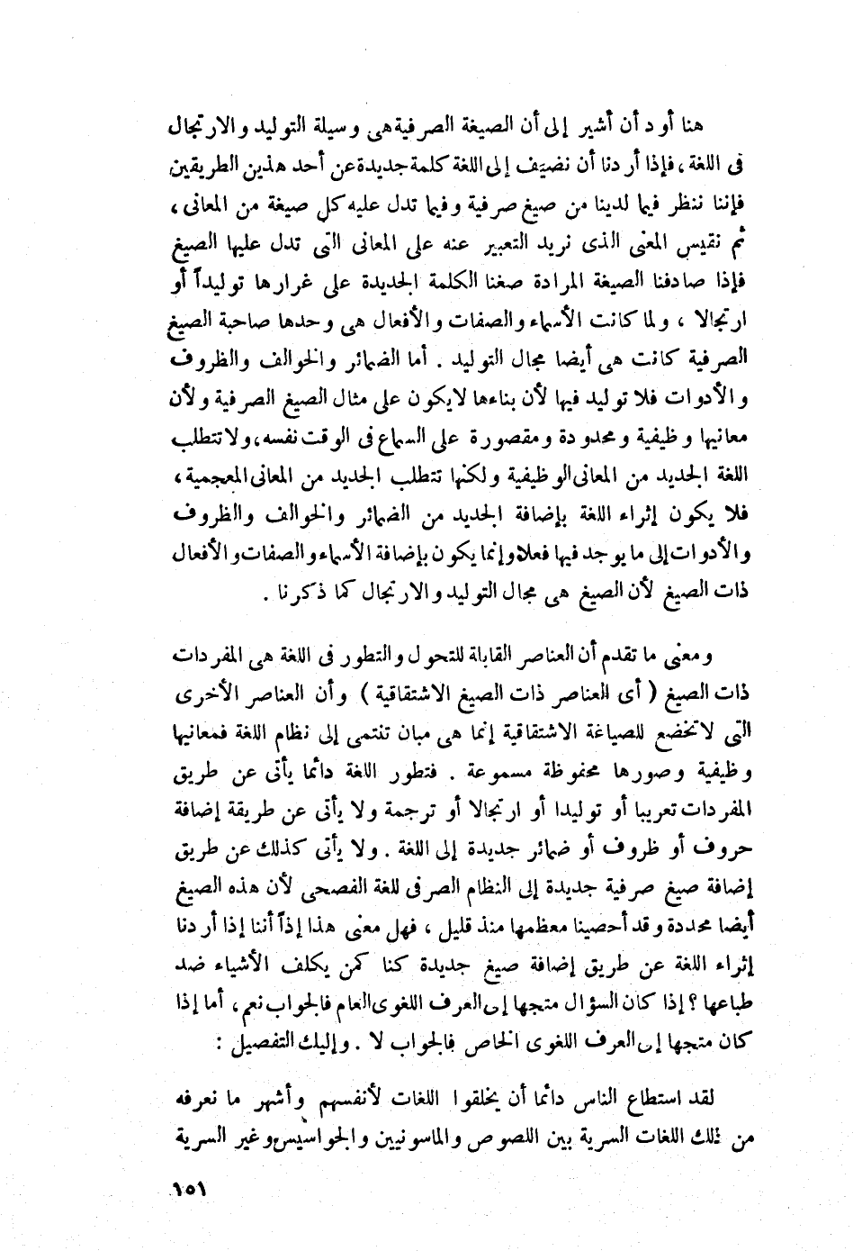هنا أودّ أن أشير إلى أن الصيغة الصرفية هي وسيلة التوليد والارتجال في اللغة، فإذا أردنا أن نضيف إلى اللغة كلمة جديدة عن أحد هذين الطريقين فإننا ننظر فيما لدينا من صيغ صرفية وفيما تدل عليه كل صيغة من المعاني، ثم نقيس المعنى الذي نريد التعبير عنه على المعاني التي تدل عليها الصيغ, فإذا صادفنا الصيغة المرادة صغنا الكلمة الجديدة على غرارها توليدًا أو ارتجالًا، ولما كانت الأسماء والصفات والأفعال هي وحدها صاحبة الصيغ الصرفية كانت هي أيضًا مجال التوليد. أما الضمائر والخوالف والظروف والأدوات فلا توليد فيها لأنَّ بناءها لا يكون على مثال الصيغ الصرفية؛ ولأن معانيها وظيفية ومحدودة ومقصورة على السماع في الوقت نفسه، ولا تتطلّب اللغة الجديد من المعاني الوظيفية, ولكنها تتطلب الجديد من المعاني المعجمية، فلا يكون إثراء اللغة بإضافة الجديد من الضمائر والخوالف والظروف والأدوات إلى ما يوجد فيها فعلًا, وإنما يكون بإضافة الأسماء والصفات والأفعال ذات الصيغ؛ لأن الصيغ هي مجال التوليد والارتجال كما ذكرنا.