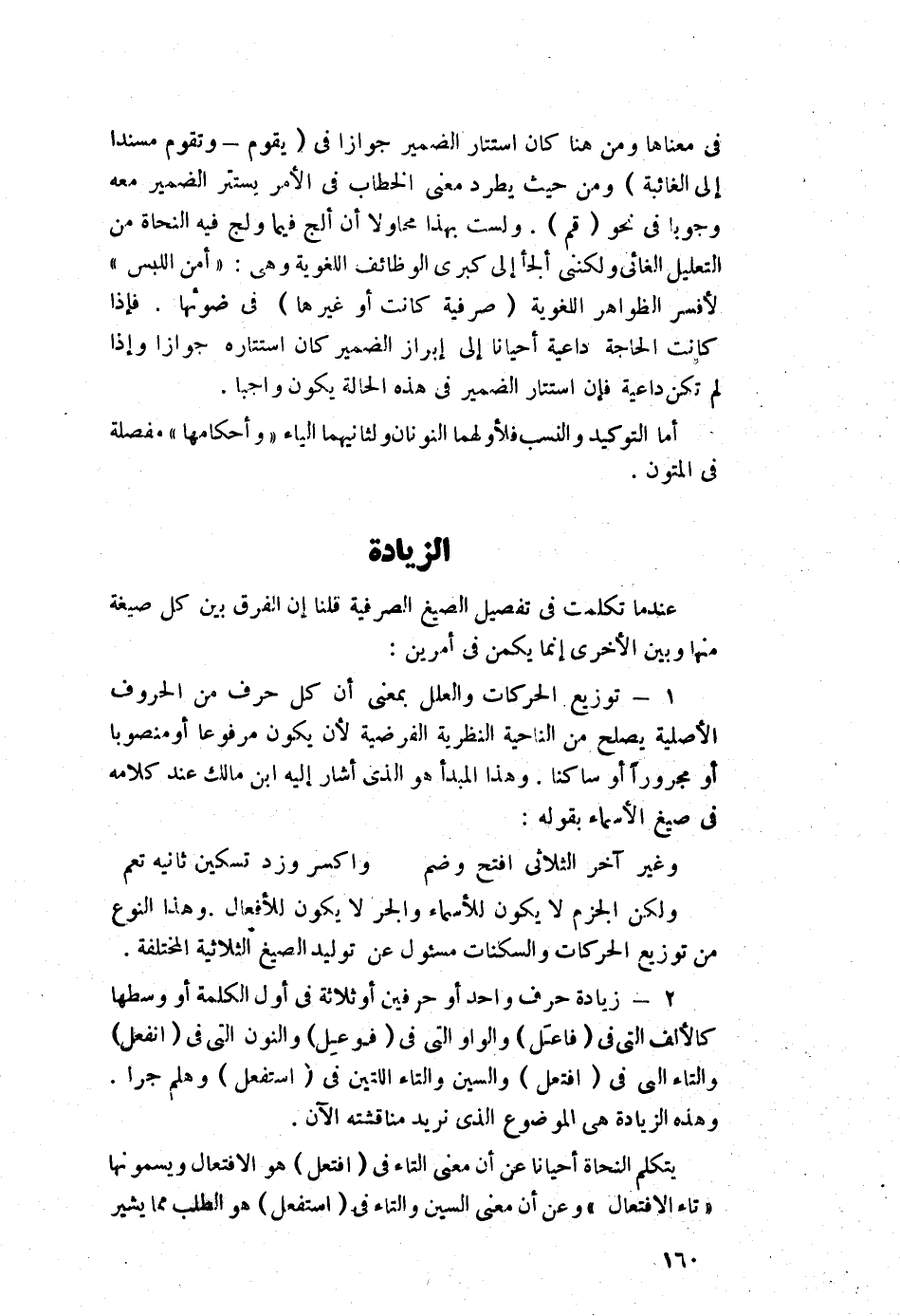 2- زيادة حرف واحد أو حرفين أو ثلاثة في أول الكلمة أو وسطها كالألف التي في "فاعل", والواو التي في "فوعل", والنون التي في "انفعل", والتاء التي في "افتعل", والسين والتاء اللتين في "استفعل", وهلم جرا. وهذه الزيادة هي الموضوع الذي نريد مناقشته الآن.