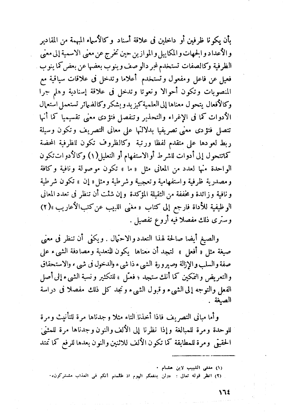 بأن يكونا ظرفين أو داخلين في علاقة إسناد, وكالأسماء المبهمة من المقادير والأعداد والجهات والمكاييل والموازين حين تخرج عن معنى الاسمية إلى معنى الظرفية, وكالصفات تستخدم لمجرد الوصف وينوب بعضها عن بعض كما ينوب فعيل عن فاعل ومفعول, وتستخدم أعلامًا وتدخل في علاقات سياقية مع المنصوبات, وتكون أحوالًا ونعوتًا, وتدخل في علاقة إسنادية, وهلمَّ جرا, وكالأفعال يتحوّل معناها إلى العملية كيزيد ويشكر, وكالضمائر تستعمل استعمال الأدوات كما في الإغراء والتحذير, وتنفصل فتؤدي معنى تقسيميًّا كما أنها تتصل فتؤدي معنى تصريفيًّا بدلاتها على معاني التصريف, وتكون وسيلة ربط لعودها على متقدِّم لفظًا ورتبةً, وكالظروف تكون للظرفية المحضة, كما تتحول إلى أدوات للشرط أو الاستفهام أو التعليل1, وكالأدوات تكون الواحدة منها لعدد من المعاني مثل: "ما" تكون موصولة ونافية وكافة ومصدرية ظرفية واستفهامية وتعجيبة وشرطية, ومثل: "إن" تكون شرطية ونافية وزائدة ومخففة من الثقيلة المؤكدة, وإن شئت أن تنظر في تعدد المعاني الوظيفية للأداة فارجع إلى كتاب "مغني اللبيب عن كتب الأعاريب"2 وسترى ذلك مفصلًا فيه أروع تفصيل.