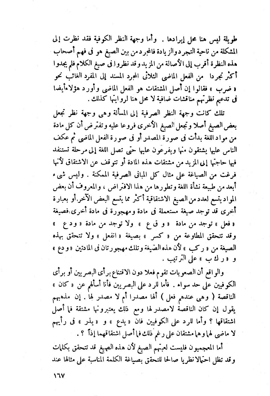 تلك كانت وجهة النظر الصرفية إلى المسألة, وهي وجهة نظر تجعل بعض الصيغ أصلًا, وتجعل الصيغ الأخرى فروعًا عليه, وتفترض أن كل مادة من مواد اللغة بدأت في صورة المصدر أو في صورة الفعل الماضي, ثم عكف الناس عليها يشتقون منها ويفرعون عليها, حتى تصل اللغة إلى مرحلة تستنفد فيها حاجتها إلى المزيد من مشتقات هذه المادة, أو تتوقف عن الاشتقاق لأنها فرغت من الصياغة على مثال كل المباني الصرفية الممكنة. وليس شيء أبعد من طبيعة نشأة اللغة وتطورها من هذا الافتراض، والمعروف أن بعض المواد يتَّسع لعدد من الصيغ الاشتقاقية أكثر ما يتَّسع البعض الآخر, أو بعبارة أخرى قد توجد صيغة مستعملة في مادَّة ومهجورة في مادة أخرى, فصيغة "فعل" توجد من مادة "وق ع" ولا توجد من مادة "ود ع", وقد تتحقق المطاوعة من "كسر" بصيغة "انفعل", ولا تتحقق بهذه الصيغة من "ركب"؛ لأن هذه الصيغة وتلك مهجوران في المادتين "ودع" و"رك ب" على الترتيب.