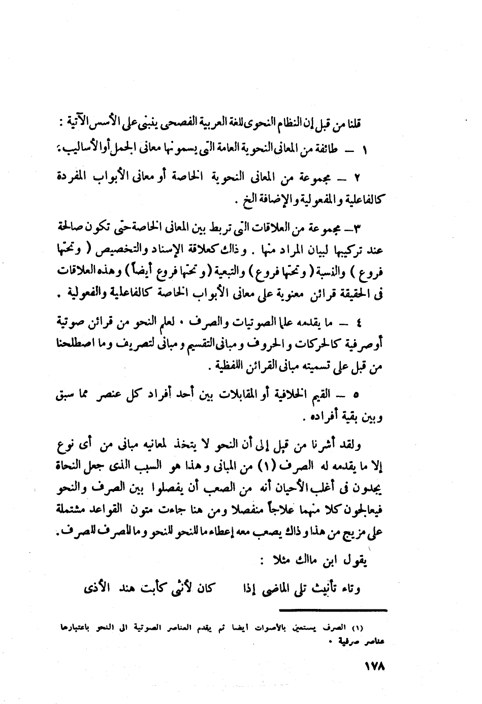 ولقد أشرنا من قبل إلى أنَّ النحو لا يتخذ لمعانيه مباني من أي نوع إلّا ما يقدمه له الصرف1 من المباني, وهذا هو السبب الذي جعل النحاة يجدون في أغلب الأحيان أنه من الصعب أن يفصلوا بين الصرف والنحو فيعالجون كلًّا منهما علاجًا منفصلًا, ومن هنا جاءت متنون القواعد مشتملة على مزيج من هذا وذاك يصعب معه إعطاء ما للنحو وما للصرف للصرف.
