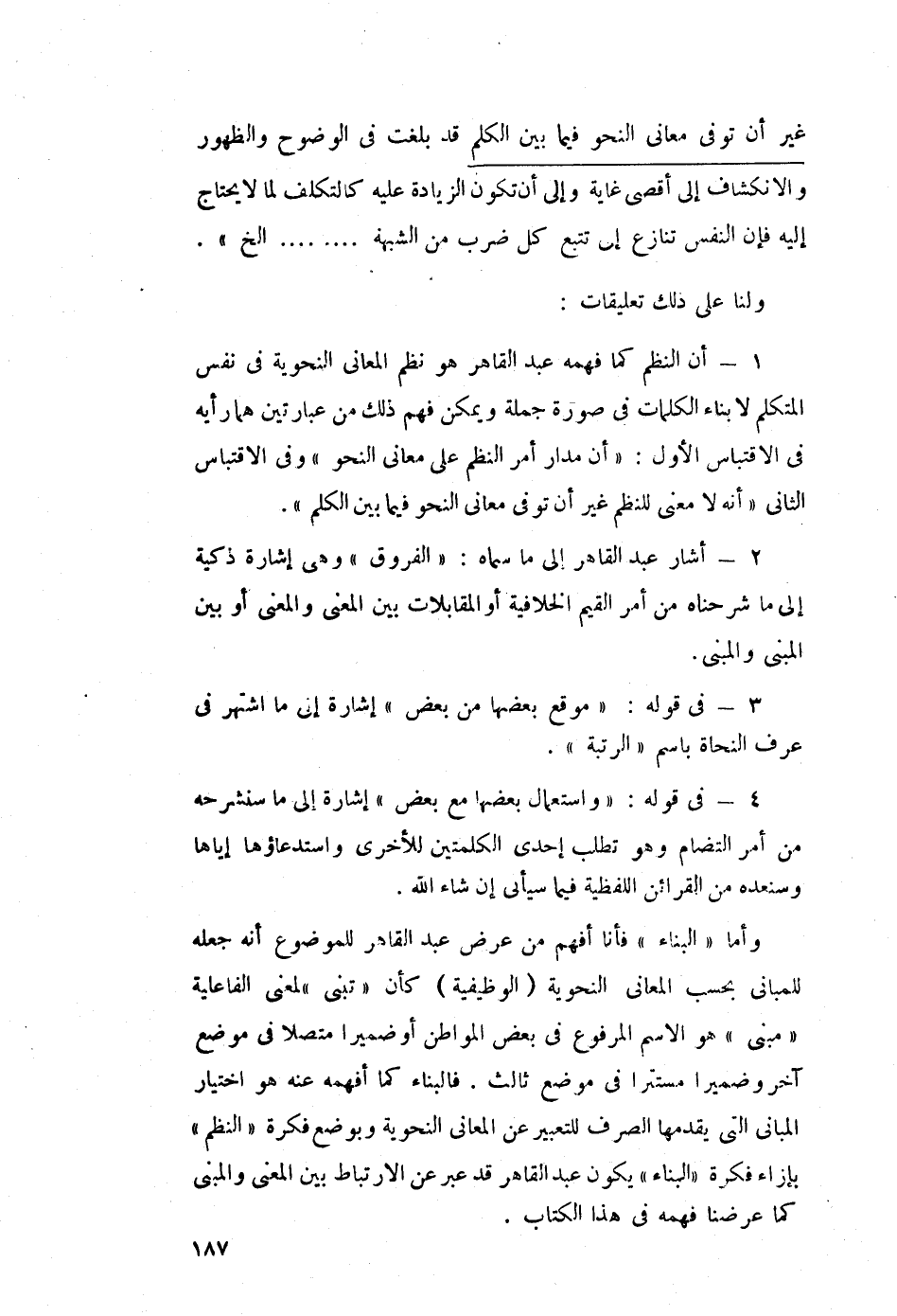 غير أن توفي معاني النحو فيما بين الكلم قد بلغت في الوضوح والظهور والانكشاف إلى أقصى غاية وإلى أن تكون الزيادة عليه؛ كالتكلف لما لا يحتاج إليه, فإن النفس تنازع إلى تتبع كل ضرب من الشبهة.... إلخ.