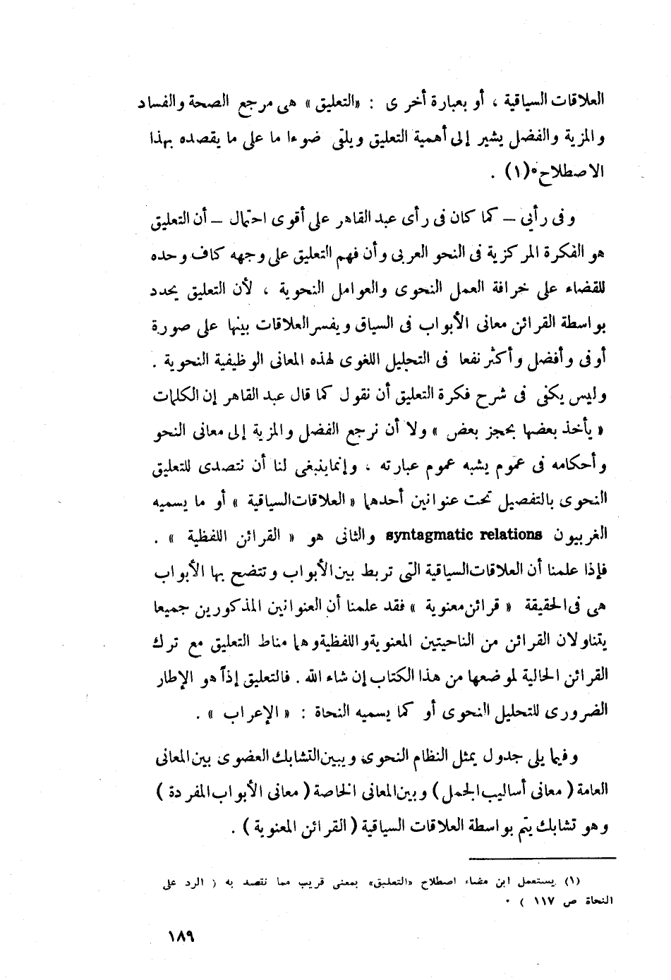 وفي رأيي -كما كان في رأي عبد القاهر على أقوى احتمال- أن التعليق هو الفكرة المركزية في النحو العربي, وأن فهم التعليق على وجههٍ كافٍ وحده للقضاء على خرافة العمل النحوي والعوامل النحوية، لأن التعليق يحدد بواسطة القرائن معاني الأبواب في السياق, ويفسر العلاقات بينها على صورة أوفى وأفضل وأكثر نفعًا في التحليل اللغوي لهذه المعاني الوظيفية النحوية. وليس يكفي في شرح فكرة التعليق أن نقول كما قال عبد القاهر: إن الكلمات "يأخذ بعضها بحجز بعض", ولا أن نرجع الفضل والمزية إلى معاني النحو وأحكامه في عمومٍ يشبه عموم عبارته، وإنما ينبغي لنا أن نتصدَّى للتعليق النحوي بالتفصيل تحت عنوانين؛ أحدهما: "العلاقات السياقية", أو ما يسميه الغربيون syntagmatic relations والثاني هو: "القرائن اللفطية". فإذا علمنا أن العلاقات السياقية التي تربط بين الأبواب وتتضح بها الأبواب هي في الحقيقة "قرائن معنوية", فقد علمنا أن العنوانين المذكورين جميعًا يتناولان القرائن من الناحيتين المعنوية واللفظية, وهما مناط التعليق مع ترك القرائن الحالية لوضعها من هذا الكتاب إن شاء الله, فالتعليق إذًا هو الإطار الضروري للتحليل النحوي, أو كما يسميه النحاة: "الإعراب".