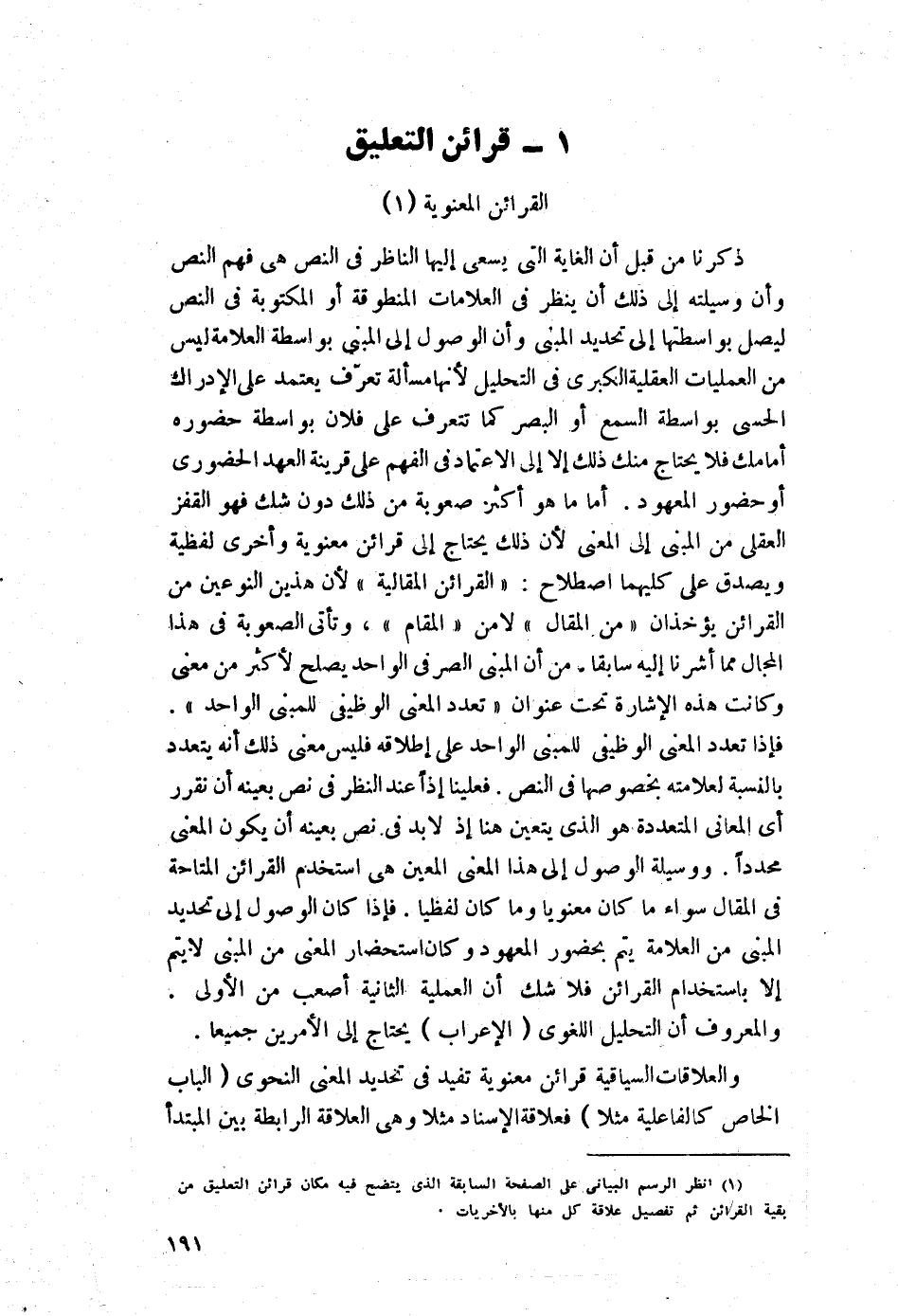 1 انظر الرسم البياني على الصفحة السابقة الذي يتضح فيه مكان قرائن التعليق من بقية القرائن, ثم تفصيل علاقة كلٍّ منها بالآخريات.