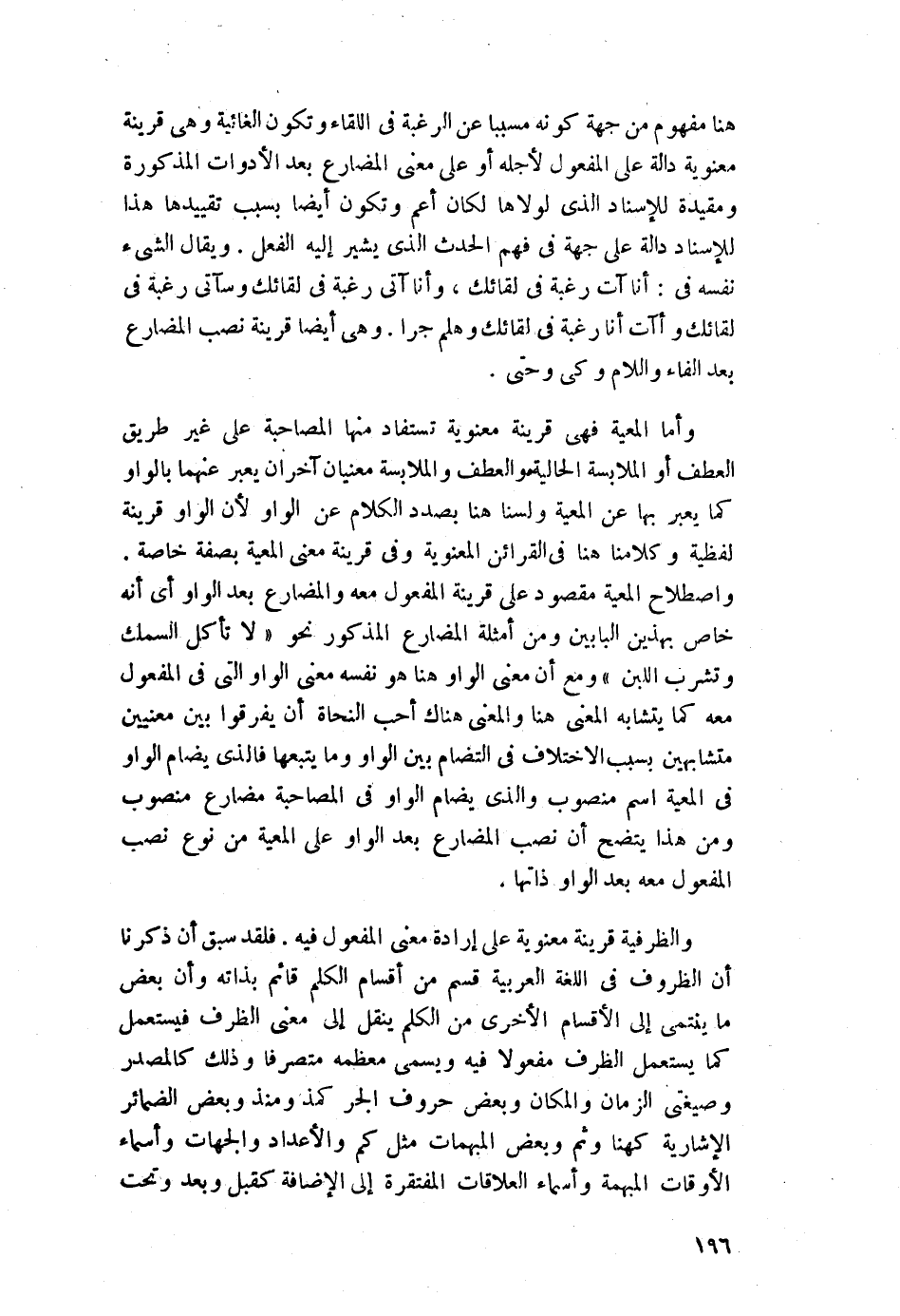 وأما المعية فهي قرينة معنوية تستفاد منها المصاحبة على غير طريق العطف أو الملابسة الحالية, والعطف والملابسة معنيان آخران يعبَّر عنهما بالواو كما يعبَّر بها عن المعية, ولسنا هنا بصدد الكلام عن الواو؛ لأن الواو قرينة لفظية, وكلامنا هنا في القرائن المعنوية, وفي قرينة معنى المعية بصفة خاصة. واصطلاح المعية مقصود على قرينة المفعول معه والمضارع بعد الواو, أي: إنه خاص بهذين البابين, ومن أمثلة المضارع المذكور نحو: "لا تأكل السمك وتشرب اللبن", ومع أن معنى الواو هنا هو نفسه معنى الواو التي في المفعول معه, كما يتشابه المعنى هنا والمعنى هناك, أحب النحاة أن يفرقوا بين معنيين متشابهين بسبب الاختلاف في التضامّ بين الواو وما يتبعها, فالذي يضامّ الواو في المعية اسم منصوب, والذي يضام الواو في المصاحبة مضارع منصوب, ومن هذا يتضح أن نصب المضارع بعد الواو على المعية من نوع نصب المفعول معه بعد الواو ذاتها.