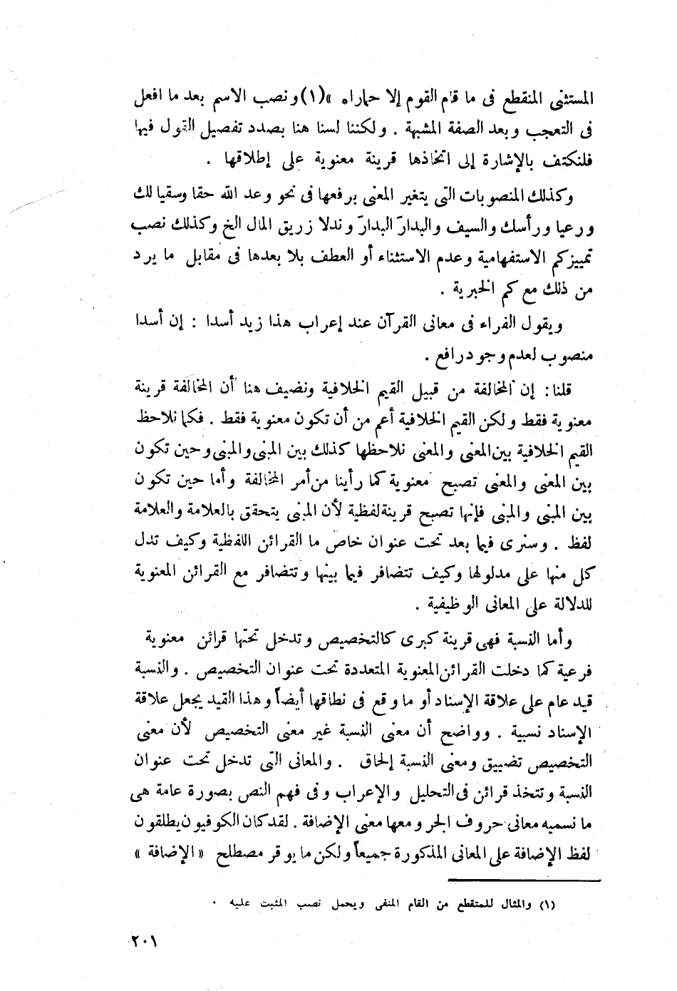 المستثنى المنقطع في ما قام القوم إلا حمارًا"1, ونصب الاسم بعد ما أفعل في التعجب وبعد الصفة المشبهة, ولكننا لسنا هنا بصدد تفصيل القول فيها, فلنكتف بالإشارة إلى اتخاذها قرينة معنوية على إطلاقها.