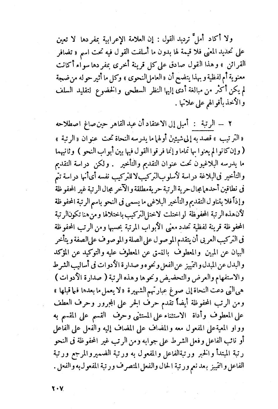 2- الرتبة: أميل إلى الاعتقاد أن عبد القاهر حين صاغ اصطلاحه "الترتيب" قصد به إلى شيئين؛ أولهما: ما يدرسه النحاة تحت عنوان: "الرتبة" "وإن كانوا لم يعنوا بها تمامًا, وإنما فرقوا القول فيها بين أبواب النحو", وثانيهما: ما يدرسه البلاغيون تحت عنوان التقديم والتأخير, ولكنَّ دراسة التقديم والتأخير في البلاغة دراسةً لأسلوب التركيب لا للتركيب نفسه, أي: إنها دراسة تتمّ في نطاقين أحدهما: مجال حرية الرتبة حرية مطلقة, والآخر: مجال الرتبة غير المحفوظة, وإذًا فلا يتناول التقديم والتأخير البلاغي ما يسمَّى في النحو باسم الرتبة المحفوظة؛ لأن هذه الرتبة المحفوظة لو اختلت لاختلَّ التركيب باختلالها, ومن هنا تكون الرتبة المحفوظة قرينة لفظية تحدد معنى الأبواب المرتبة بحسبها, ومن الرتب المحفوظة في التركيب العربي أن يتقدم الموصول على الصلة, والموصوف على الصفة, ويتأخر البيان عن المبين, والمعطوف بالنسق على المعطوف عليه, والتوكيد عن المؤكد, والبدل عن المبدل, والتمييز عن الفعل ونحوه, وصدارة الأدوات في أساليب الشرط, والاستفهام والعرض والتحضيض ونحوها, وهذه الرتبة "صدارة الأدوات" هي التي دعت النحاة إلى صوغ عبارتهم الشهيرة "لا يعمل ما بعدها فيما قبلها", ومن الرتب المحفوظة أيضًا تقدم حرف الجر على المجرور, وحرف العطف على المعطوف, وأداة الاستثناء على المستثنى, وحرف القسم على المقسم به, وواو المعية على المفعول معه, والمضاف على المضاف إليه, والفعل على الفاعل أونائب الفاعل, وفعل الشرط على جوابه, ومن الرتب غير المحفوظة في النحو رتبة المبتدأ والخبر, ورتبة الفاعل والمفعول به, ورتبة الضمير والمرجع, ورتبة الفاعل والتمييز بعد نعم, ورتبة الحال والفعل المتصرف, ورتبة المفعول به والفعل.