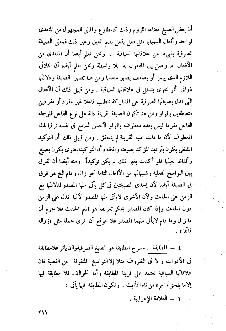 أن بعض الصيغ معناها اللزوم, وذلك كالمطاوع والمبني للمجهول من المتعدي لواحد, وأفعال السجايا مثل فعل يفعل -بضم العين, وغير ذلك, فمعنى الصيغة الصرفية ينبئ عن علاقاتها السياقية, ونحن نعلم أيضًا أن المتعدي من الأفعال ما وصل إلى المفعول به بلا واسطة, ونحن نعلم أيضًا أن الثلاثي اللازم الذي يهمز أو يضعَّف يصير متعديًّا, ومن هنا تصير الصيغة ودلالتها ذواتي أثر نحوي يتمثل في علاقاتها السياقية, ومن قبيل ذلك أنَّ الأفعال التي تدلّ بصيغتها الصرفية على المشاركة تتطلب فاعلًا غير مفرد أو مفردين متعاطفين بالواو, ومن هنا تكون الصيغة قرينة دالة على نوع الفاعل, فلو جاء الفاعل مفردًا ليس بعده معطوف بالواو لأحسَّ السامع في نفسه ترقبًا لهذا المعطوف؛ لأن ما دلت عليه القرينة لم يتحقق. ومن قبيل ذلك أن التوكيد اللفظي يكون بترديد المؤكد بصيغته ولفظه, وأن التوكيد المعنوي يكون بصيغ وألفاظ بعينها, فلو أكدت بغير ذلك لم يكن توكيدًا. ومنه أيضًا أن الفرق بين النواسخ الفعلية وشبهاتها من الأفعال التامة نحو: زال ودام إلخ, هو فرق في الصيغة أيضًا؛ لأن إحدى الصيغتين في كل يأتي منها المصدر لدلالتها مع الزمن على الحدث؛ ولأن الأخرى لا يأتي منها المصدر؛ لأنها تدل على الزمن دون الحدث, وإذا كان المصدر بحكم تعريفه هو اسم الحدث فلا جرم أن ما زال وما دام لا يأتي منهما المصدر, فلا نتوقع أن نرى جملة مثل: "زواله قائمًا".