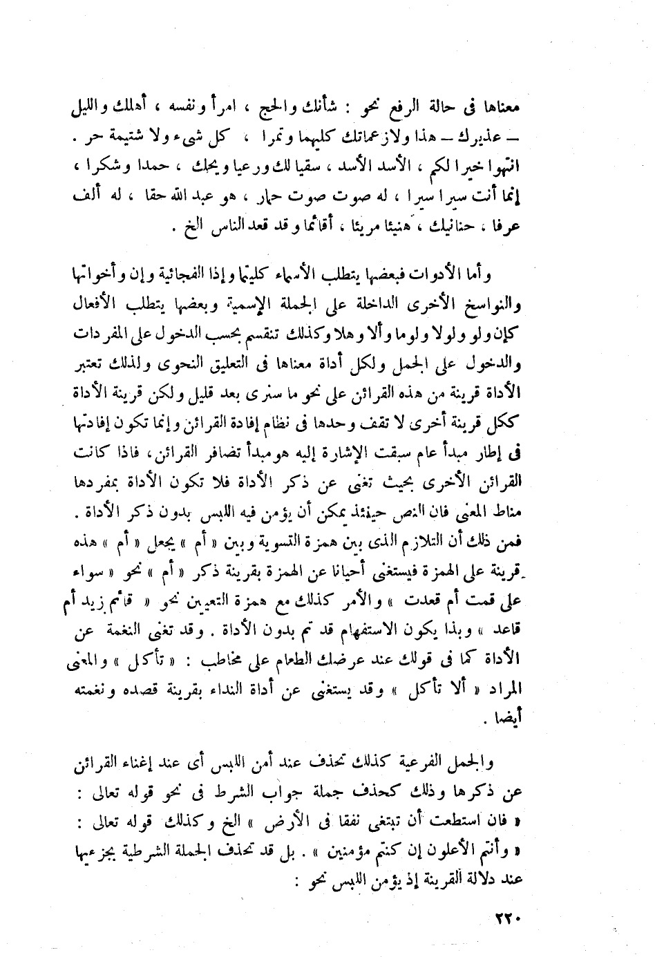 وأما الأدوات فبعضها يتطلب الأسماء كليتما وإذا الفجائية وإن وأخواتها والنواسخ الأخرى الداخلة على الجملة الاسمية, وبعضها يتطلب الأفعال كان ولو ولولا وألا وهلا, وكذلك تنقسم بحسب الدخول على المفردات, والدخول على الجمل, ولكل أداة معناها في التعليق النحوي, ولذلك تعتبر الأداة قرينة من هذه القرائن على نحو ما سنرى بعد قليل, ولكنّ قرينة الأداة ككل قرينة أخرى لا تقف وحدها في نظام إفادة القرائن, وإنما تكون إفادتها في إطار مبدأ عام سبقت الإشارة إليه هو مبدأ تضافر القرائن، فإذا كانت القرائن الأخرى بحيث تغني عن ذكر الأداة, فلا تكون الأداة بمفردها مناط المعنى, فإن النص حينئذ يمكن أن يؤمن فيه اللبس بدون ذكر الأداة. فمن ذلك أن التلازم الذي بين همزة التسوية وبين "أم" يجعل "أم" هذه قرينة على الهمزة فيستغنى أحيانًا عن الهمزة بقرينة ذكر "أم" نحو: "سواء علا قمت أم قعدت", والأمر كذلك مع همزة التعيين نحو: "قائم زيد أم قاعد", وبذا يكون الاستفهام قد تَمَّ بدون الأداة, وقد تغني النغمة عن الأداة كما في قولك عند عرضك الطعام على مخاطب: "تأكل", والمعنى المراد "ألا تأكل" وقد يستغنى عن أداة النداء بقرينة قصده ونغمته أيضًا.