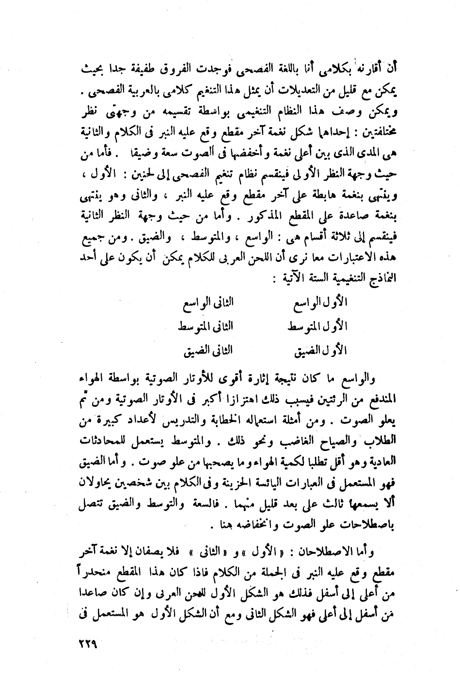 أن أقارنه بكلامي أنا باللغة الفصحى, فوجدت الفروق طفيفة جدًا بحيث يمكن مع قليل من التعديلات أن يمثل هذا التنغيم كلامي بالعربية الفصحى. ويمكن وصف هذا النظام التغيمي بواسطة تقسيمه من وجهتي نظر مختلفتين: إحداهما: شكل نغمة آخر مقطع وقع عليه النبر في الكلام, والثانية: هي المدى الذي بين أعلى نغمة وأخفضها في الصوت سعةً وضيقًا. فأما من حيث وجهة النظر الأولى فينقسم نظام تنغيم الفصحى إلى لحنين: الأول: وينتهي بنغمة هابطة على آخر مقطع وقع عليه النبر، والثاني: وهو ينتهي بنغمة صاعدة على المقطع المذكور. وأما من حيث وجهة النظر الثانية فينقسم إلى ثلاثة أقسام هي: الواسع، والمتوسط، والضيق, ومن ج جميع هذه الاعتبارات معًا نرى أن اللحن العربي للكلام يمكن أن يكون على أحد النماذج التنغيمية الستة الآتية: