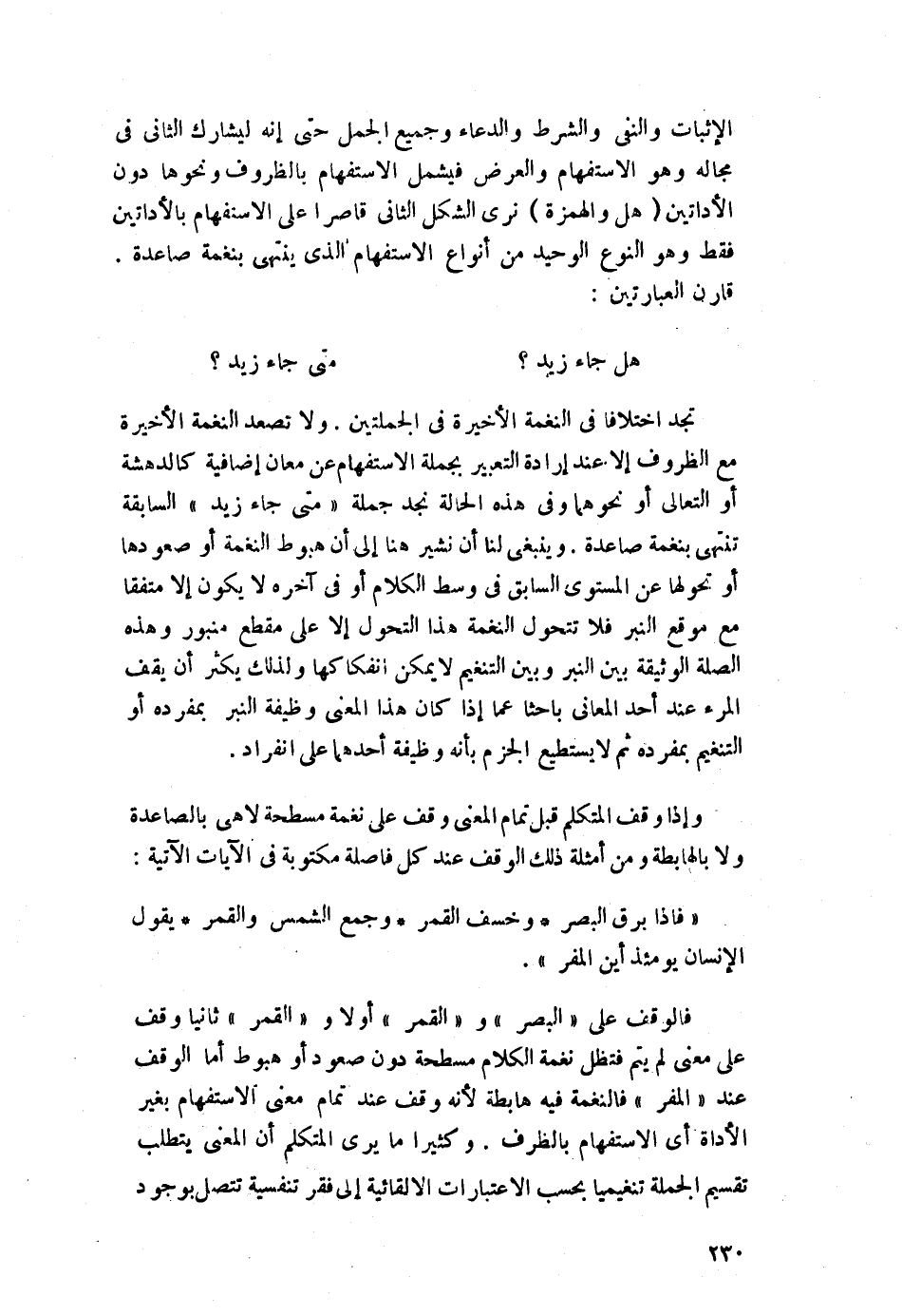 فالوقف على "البصر" و"القمر" أولًا, و"القمر" ثانيًا, وقف على معنى لم يتمّ فتظل نغمة الكلام مسطحة دون صعود أو هبوط, أما الوقف عند "المفر" فالنغمة فيه هابطة؛ لأنه وقف عند تمام معنى الاستفهام بغير الأداة, أي: الاستفهام بالظرف. وكثيرًا ما يرى المتكلم أن المعنى يتطلب تقسيم الجملة تنغيميًّا بحسب الاعتبارات الإلقائية إلى فقر تنفسية تتصل بوجود