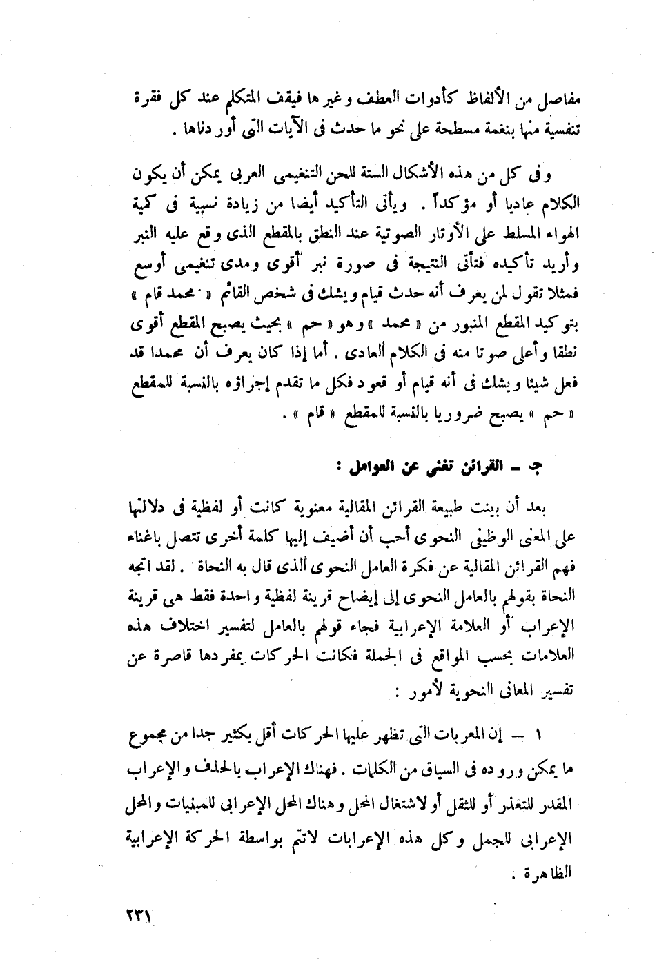 بعد أن بينت طبيعة القرائن المقالية معنوية كانت أو لفظية في دلالتها على المعنى الوظيفي النحوي, أحب أن أضيف إليها كلمة أخرى تتصل بإغناء فهم القرائن المقالية عن فكرة العامل النحوي الذي قال به النحاة. لقد اتجه النحاة بقولهم بالعامل النحوي إلى إيضاح قرينة لفظية واحدة فقط هي قرينة الإعراب أو العلامة الإعرابية, فجاء قولهم بالعامل لتفسير اختلاف هذه العلامات بحسب المواقع في الجملة, فكانت الحركات بمفردها قاصرة عن تفسير المعاني النحوية لأمور: