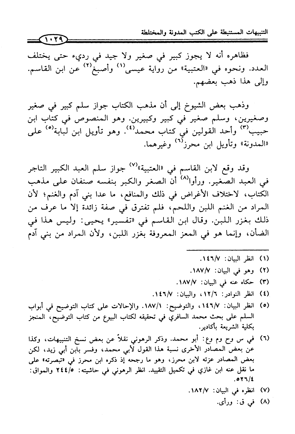 (¬5) انظر البيان: 7/ 146، والتوضيح: 1/ 187. والإحالات على كتاب التوضيح في أبواب السلم على بحث محمد السافري في تحقيقه لكتاب البيوع من كتاب التوضيح، المنجز بكلية الشريعة بأكادير.