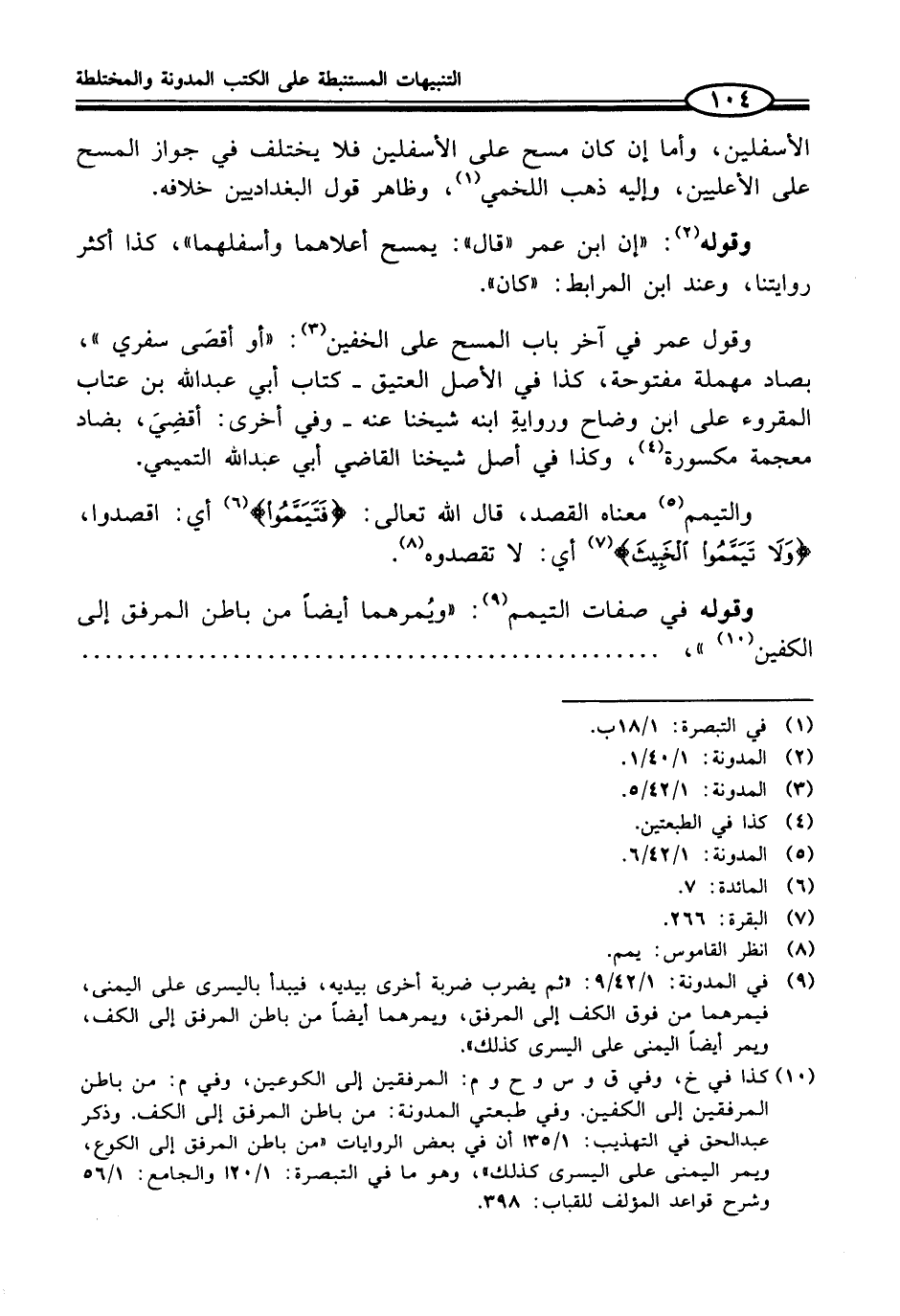 (¬9) في المدونة: 1/ 42/ 9: "ثم يضرب ضربة أخرى بيديه، فيبدأ باليسرى على اليمنى، فيمرهما من فوق الكف إلى المرفق، ويمرهما أيضاً من باطن المرفق إلى الكف، ويمر أيضاً اليمنى على اليسرى كذلك".