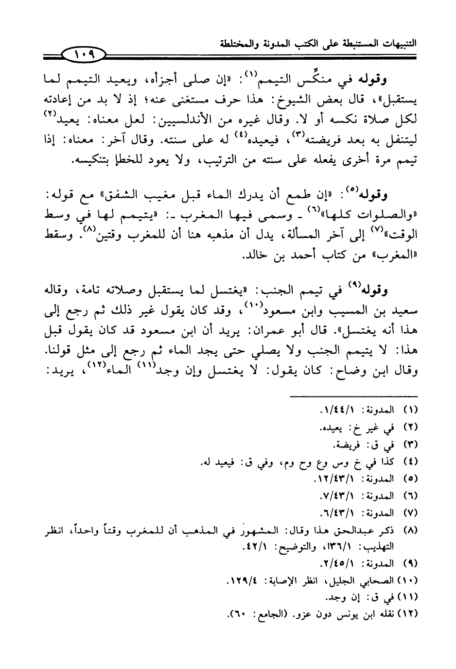 وقوله (¬5): "إن طمع أن يدرك الماء قبل مغيب الشفق" مع قوله: "والصلوات كلها" (¬6) - وسمى فيها المغرب -: "يتيمم لها في وسط الوقت" (¬7) إلى آخر المسألة، يدل أن مذهبه هنا أن للمغرب وقتين (¬8). وسقط "المغرب" من كتاب أحمد بن خالد.