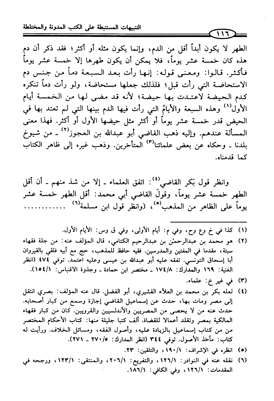 وانظر قول بَكر القاضي (¬4): اتفق العلماء - إلا من شذ منهم - أن أقل الطهر خمسة عشر يوماً، وقولَ القاضي أبي محمَّد: أقل الطهر خمسة عشر يوماً على الظاهر من المذهب (¬5)، (وانظر قول ابن مسلمة (¬6) ............