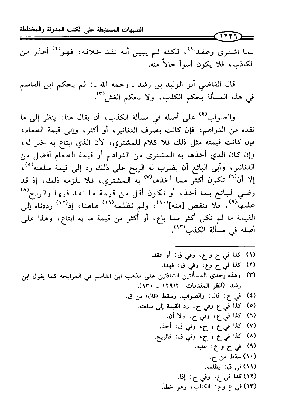 (¬3) وهذه إحدى المسألتين الشاذتين على مذهب ابن القاسم في المرابحة كما يقول ابن رشد. (انظر المقدمات: 2/ 129 - 130).