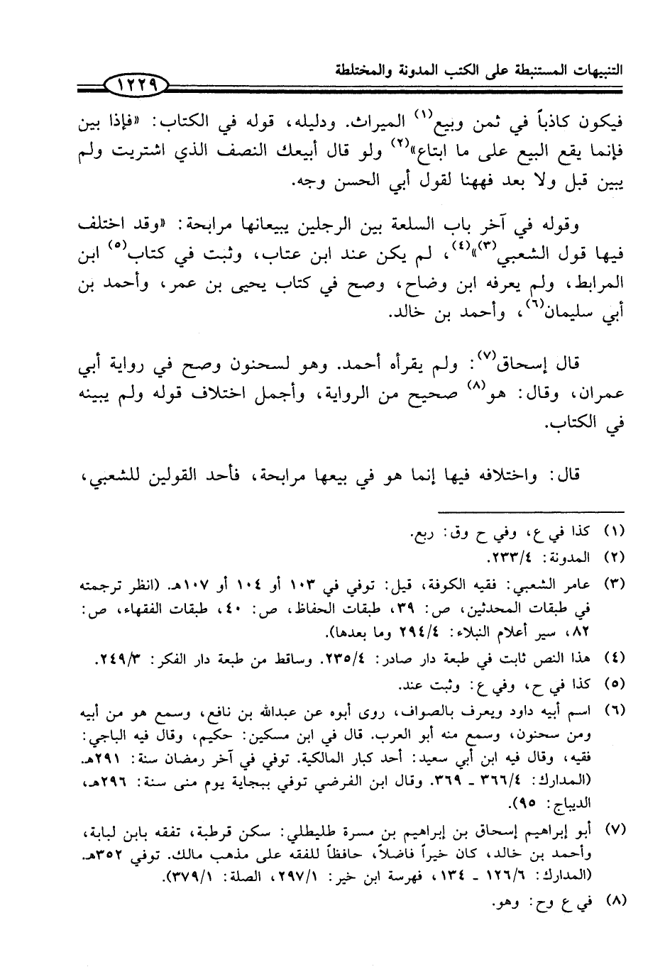 وقوله في آخر باب السلعة بين الرجلين يبيعانها مرابحة: "وقد اختلف فيها قول الشعبي (¬3) " (¬4)، لم يكن عند ابن عتاب، وثبت في كتاب (¬5) ابن المرابط، ولم يعرفه ابن وضاح، وصح في كتاب يحيى بن عمر، وأحمد بن أبي سليمان (¬6)، وأحمد بن خالد.