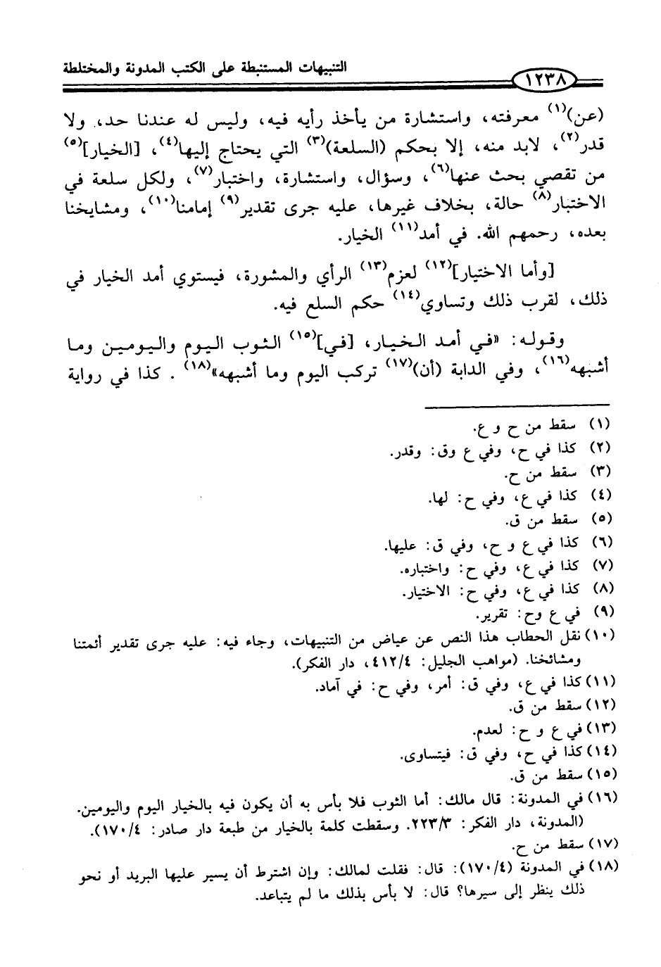 (¬10) نقل الحطاب هذا النص عن عياض من التنبيهات، وجاء فيه: عليه جرى تقدير أئمتنا ومشائخنا. (مواهب الجليل: 4/ 412، دار الفكر).