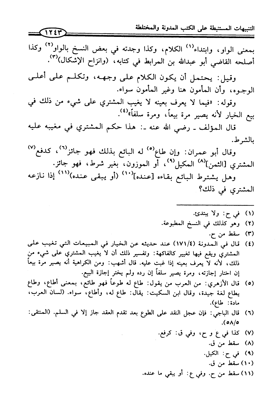 (¬4) قال في المدونة (4/ 171) عند حديثه عن الخيار في المبيعات التي تغيب على المشتري ويقع فيها تغيير كالفاكهة: وتفسير ذلك أن لا يغيب المشتري على شيء من ذلك، لأنه لا يعرف بعينه إذا غبت عليه. قال أشهب: ومن الكراهية أنه يصير مرة بيعاً إن اختار إجازته، ومرة يصير سلفاً إن رده ولم يختر إجازة البيع.