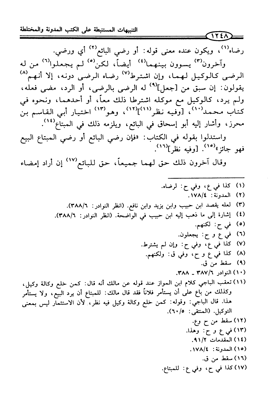 (¬11) تعقب الباجي كلام ابن المواز عند قوله عن مالك أنه قال: كمن خلع وكالة وكيل، وكذلك من باع على أن يستأمر فلاناً فقد قال مالك: للمبتاع أن يرد البيع، ولا يستأمر هذا. قال الباجي: وقوله: كمن خلع وكالة وكيل فيه نظر، لأن الاستثمار ليس بمعنى التوكيل. (المنتقى: 5/ 60).