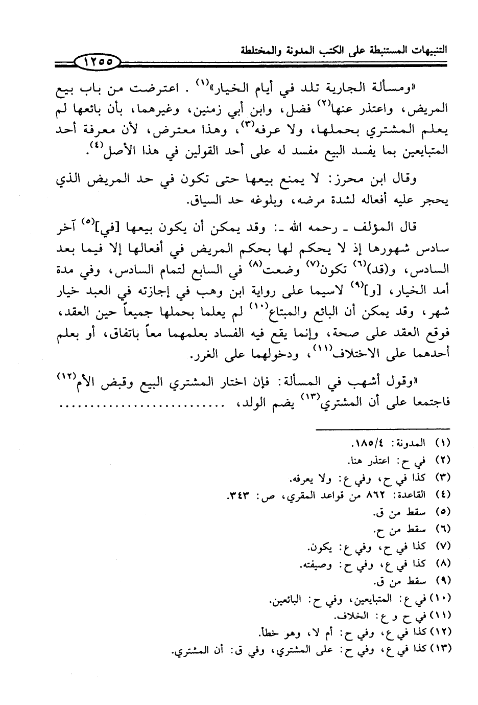 "ومسألة الجارية تلد في أيام الخيار" (¬1). اعترضت من باب بيع المريض، واعتذر عنها (¬2) فضل، وابن أبي زمنين، وغيرهما، بأن بائعها لم يعلم المشتري بحملها، ولا عرفه (¬3)، وهذا معترض، لأن معرفة أحد المتبايعين بما يفسد البيع مفسد له على أحد القولين في هذا الأصل (¬4).