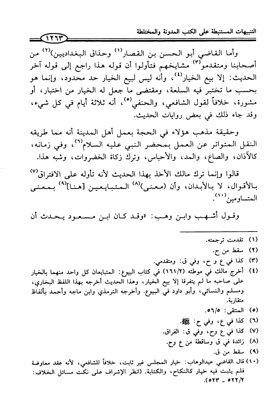 (¬10) قال القاضي عبد الوهاب: خيار المجلس غير ثابت، خلافاً للشافعي، لأنه عقد معاوضة فلم يثبت فيه خيار كالنكاح، والكتابة. (انظر الإشراف على نكت مسائل الخلاف: 2/ 522 - 523).