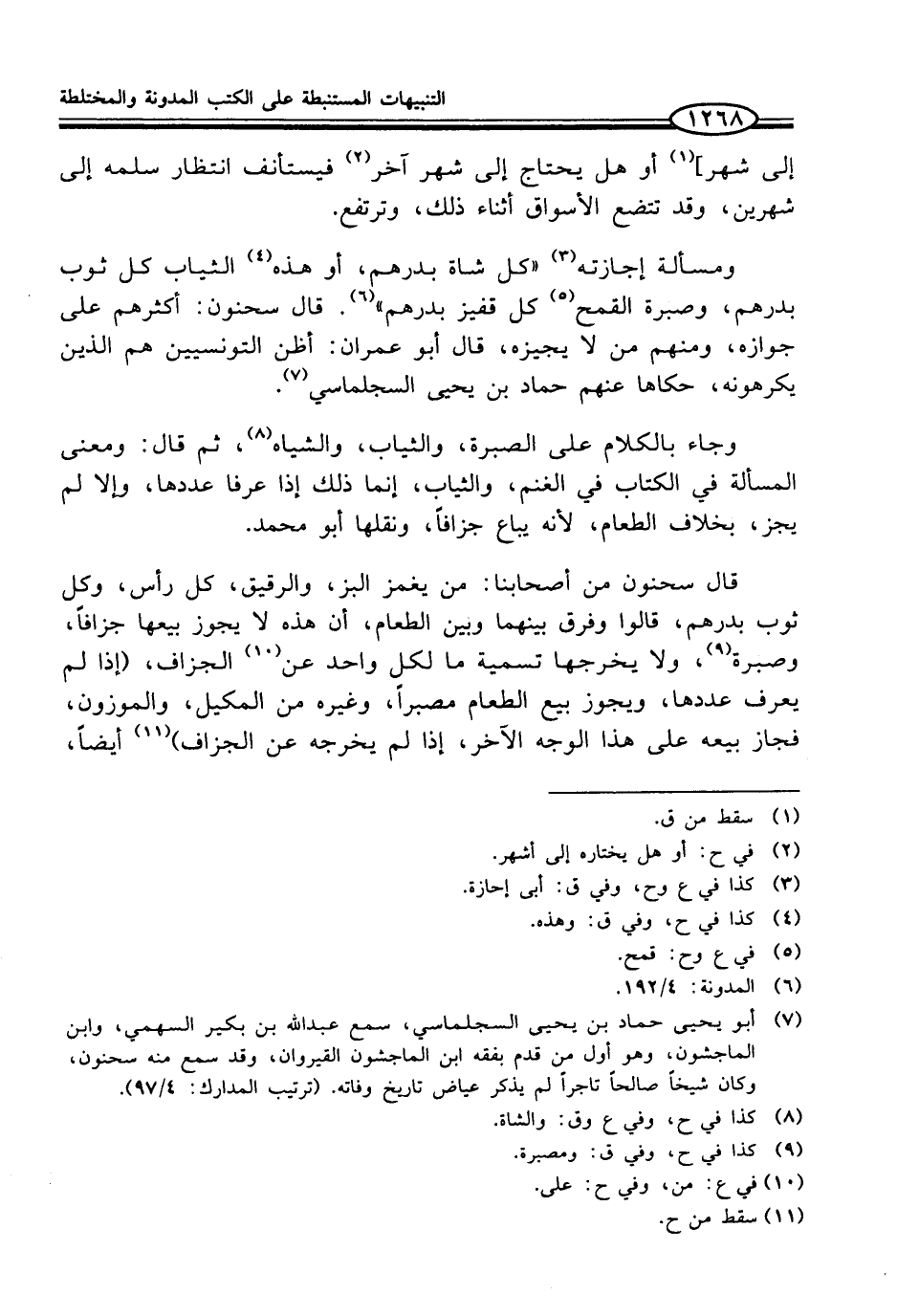 (¬7) أبو يحيى حماد بن يحيى السجلماسي، سمع عبد الله بن بكير السهمي، وابن الماجشون، وهو أول من قدم بفقه ابن الماجشون القيروان، وقد سمع منه سحنون، وكان شيخاً صالحاً تاجراً لم يذكر عياض تاريخ وفاته. (ترتيب المدارك: 4/ 97).