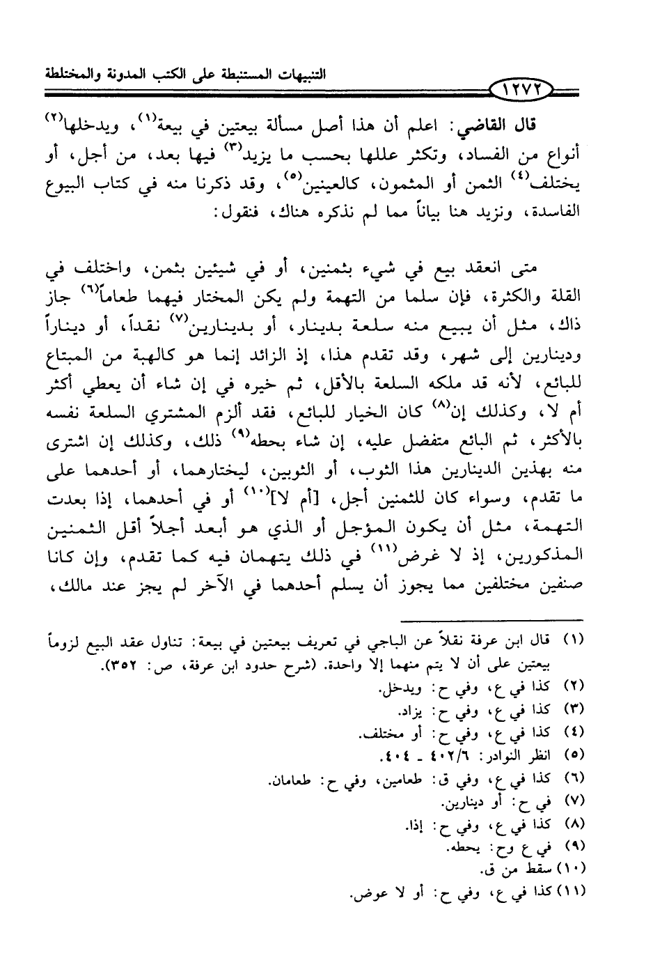 (¬1) قال ابن عرفة نقلاً عن الباجي في تعريف بيعتين في بيعة: تناول عقد البيع لزوماً بيعتين على أن لا يتم منهما إلا واحدة. (شرح حدود ابن عرفة، ص: 352).