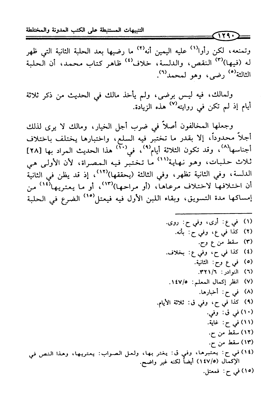 وجعلها المخالفون أصلاً في ضرب أجل الخيار، ومالك لا يرى لذلك أجلاً محدوداً، إلا بقدر ما تختبر فيه السلع، واختبارها يختلف باختلاف أجناسها (¬8)، وقد تكون الثلاثة أيام (¬9)، في (¬10) هذا الحديث المراد بها [28] ثلاث حلبات، وهو نهاية (¬11) ما تختبر فيه المصراة، لأن الأولى هي الدلسة، وفي الثانية تظهر، وفي الثالثة (يحققها) (¬12)، إذ قد يظن في الثانية أن اختلافها لاختلاف مرعاها، (أو مراحها) (¬13)، أو ما يعتريها (¬14) من إمساكها مدة التسويق، وبقاء اللبن الأول فيه فيعتل (¬15) الضرع في الحلبة