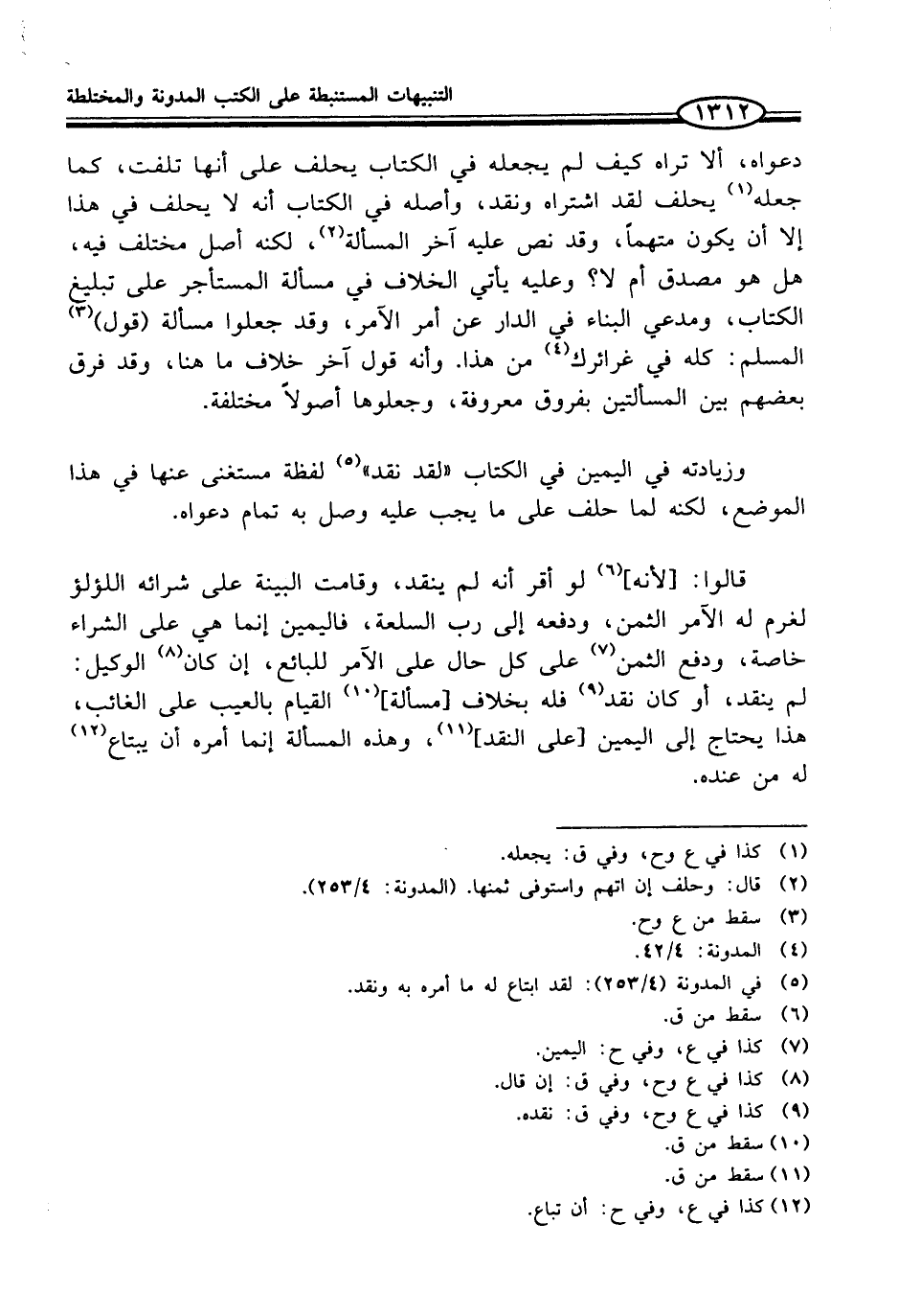 (¬2) قال: وحلف إن اتهم واستوفى ثمنها. (المدونة: 4/ 253).