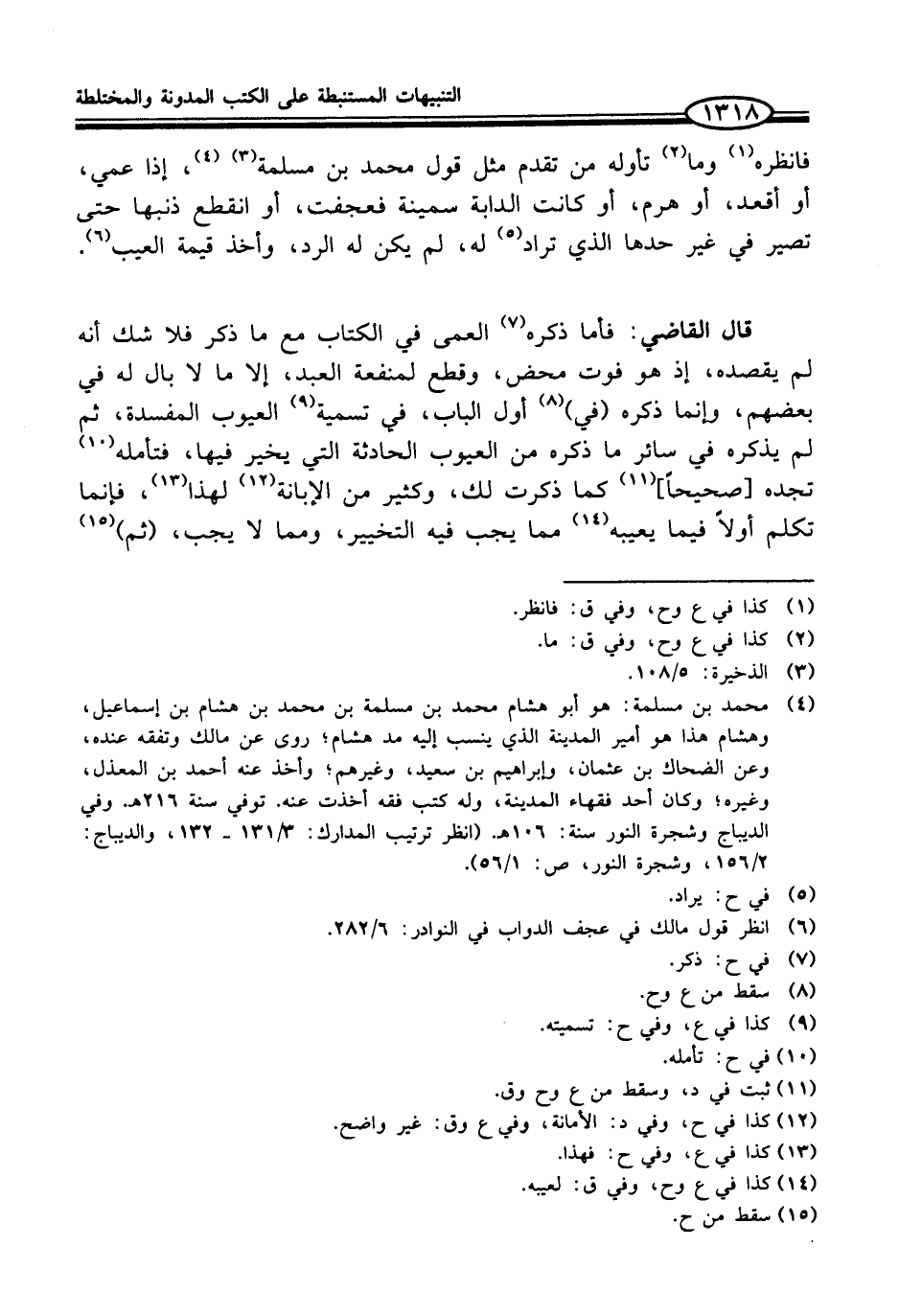 (¬4) محمد بن مسلمة: هو أبو هشام محمد بن مسلمة بن محمد بن هشام بن إسماعيل، وهشام هذا هو أمير المدينة الذي ينسب إليه مد هشام؛ روى عن مالك وتفقه عنده، وعن الضحاك بن عثمان، وإبراهيم بن سعيد، وغيرهم؛ وأخذ عنه أحمد بن المعذل، وغيره؛ وكان أحد فقهاء المدينة، وله كتب فقه أخذت عنه. توفي سنة 216 هـ. وفي الديباج وشجرة النور سنة: 106 هـ. (انظر ترتيب المدارك: 3/ 131 - 132، والديباج: 2/ 156، وشجرة النور، ص: 1/ 56).