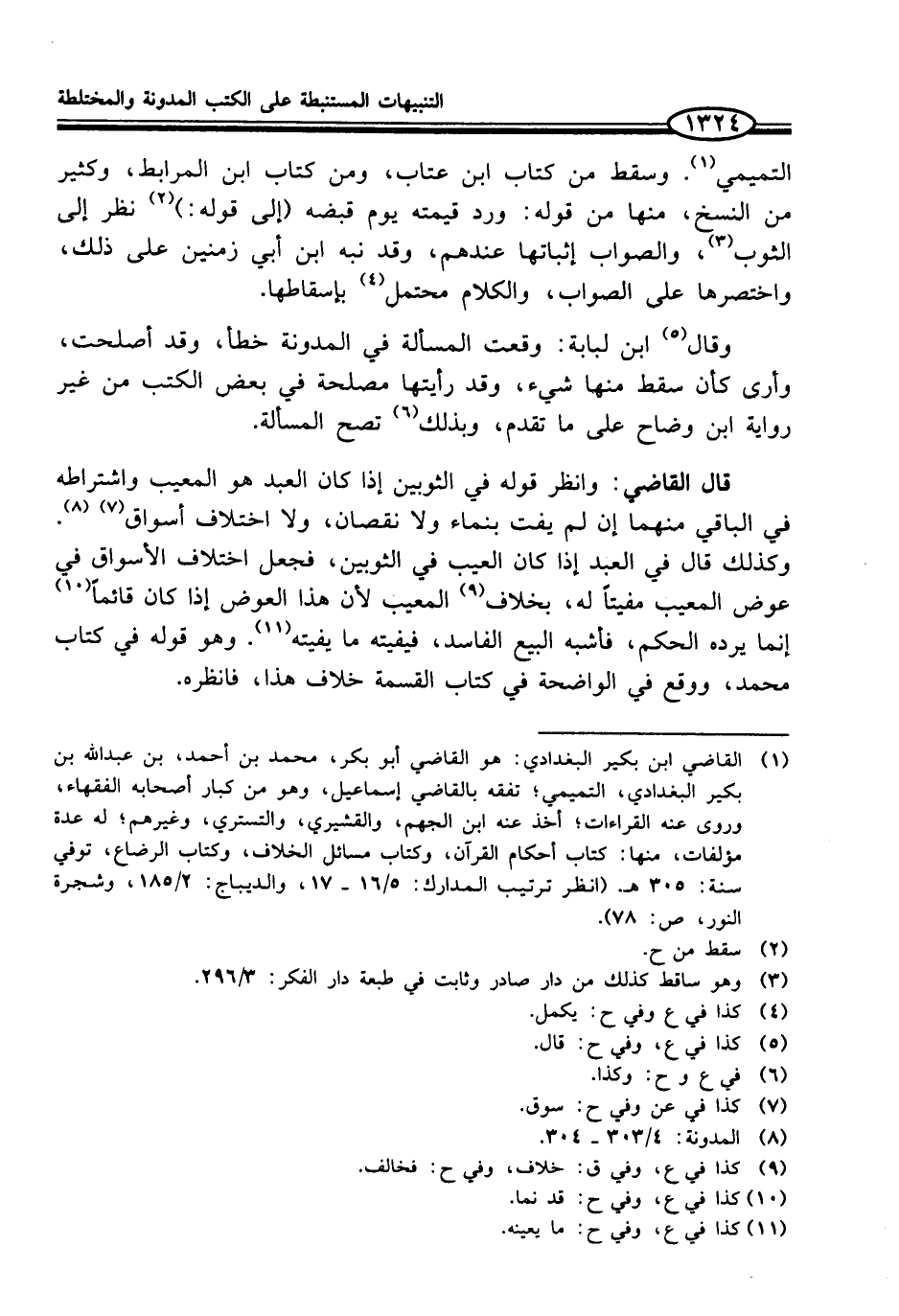 التميمي (¬1). وسقط من كتاب ابن عتاب، ومن كتاب ابن المرابط، وكثير من النسخ، منها من قوله: ورد قيمته يوم قبضه (إلى قوله:) (¬2) نظر إلى الثوب (¬3)، والصواب إثباتها عندهم، وقد نبه ابن أبي زمنين على ذلك، واختصرها على الصواب، والكلام محتمل (¬4) بإسقاطها.