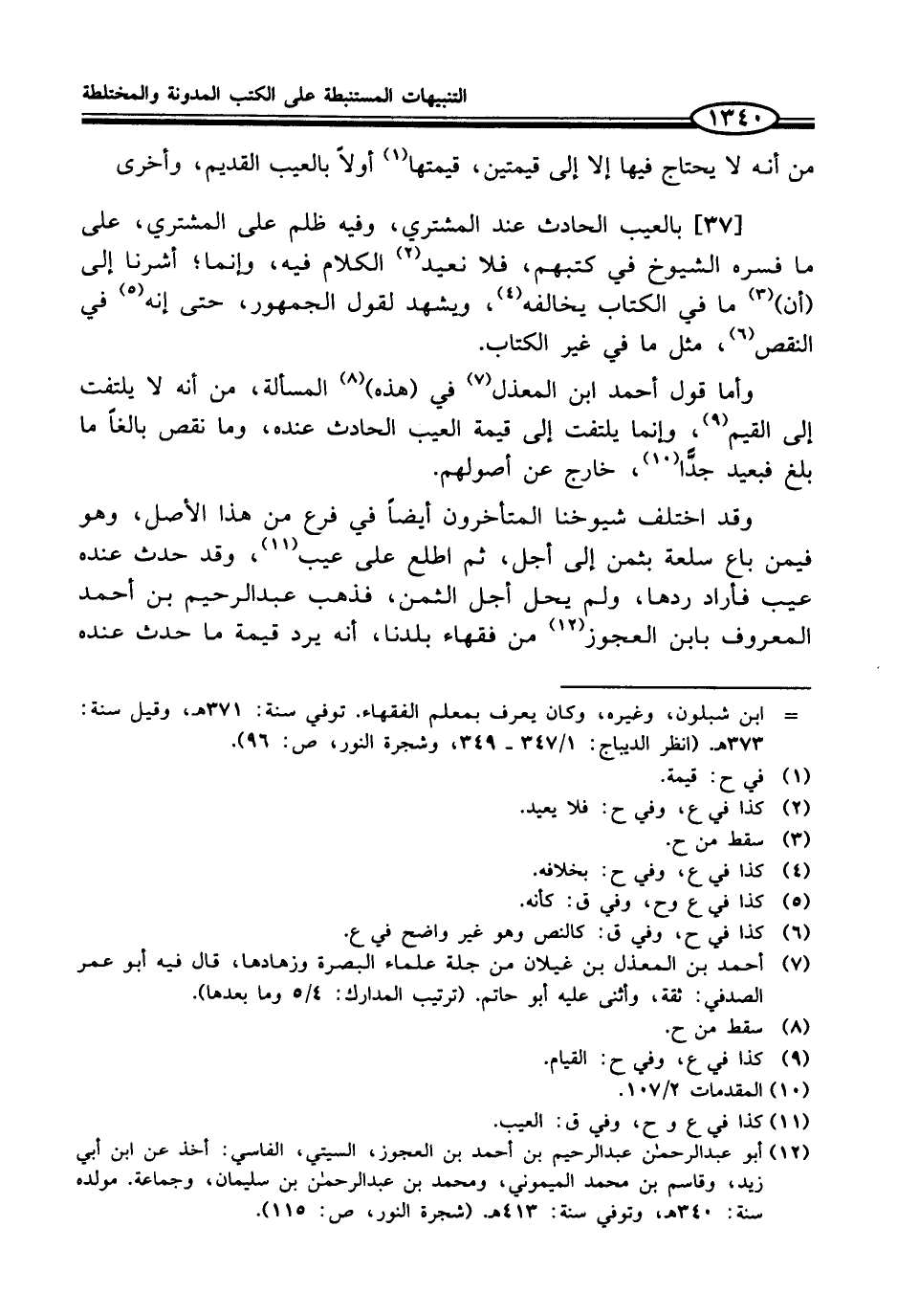 وأما قول أحمد ابن المعذل (¬7) في (هذه) (¬8) المسألة، من أنه لا يلتفت إلى القيم (¬9)، وإنما يلتفت إلى قيمة العيب الحادث عنده، وما نقص بالغاً ما بلغ فبعيد جدًّا (¬10)، خارج عن أصولهم.
