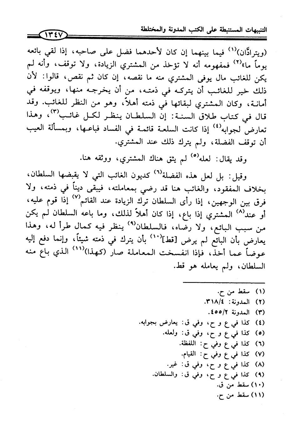 وقيل: بل لعل هذه الفضلة (¬6) كديون الغائب التي لا يقبضها السلطان، بخلاف المفقود، والغائب هنا قد رضي بمعاملته، فيبقى ديناً في ذمته، ولا فرق بين الوجهين، إذا رأى السلطان ترك الزيادة عند القائم (¬7) إذا قوم عليه، أو عند (¬8) المشتري إذا باع، إذا كان أهلاً لذلك، وما باعه السلطان لم يكن من سبب البائع، ولا رضاه، فالسلطان (¬9) ينظر فيه كمال طرأ له، وهذا يعارض بأن البائع لم يرض [قط] (¬10) بأن يترك في ذمته شيئاً، وإنما دفع إليه عوضاً عما أخذ، فإذا انفسخت المعاملة صار (كهذا) (¬11) الذي باع منه السلطان، ولم يعامله هو قط.