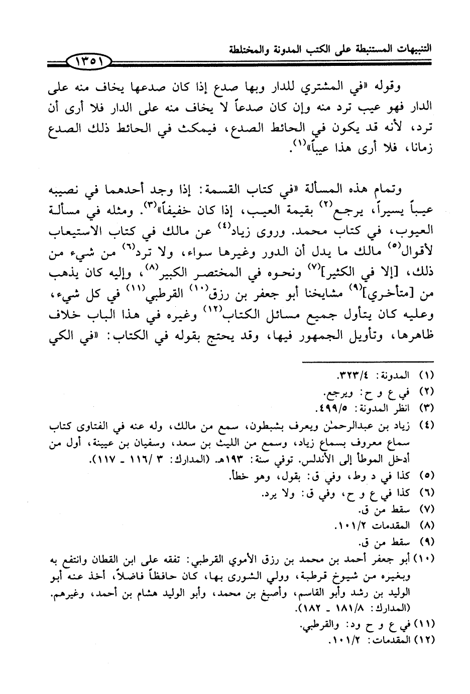 وتمام هذه المسألة "في كتاب القسمة: إذا وجد أحدهما في نصيبه عيباً يسيراً، يرجع (¬2) بقيمة العيب، إذا كان خفيفاً" (¬3). ومثله في مسألة العيوب، في كتاب محمد. وروى زياد (¬4) عن مالك في كتاب الاستيعاب لأقوال (¬5) مالك ما يدل أن الدور وغيرها سواء، ولا ترد (¬6) من شيء من ذلك، [إلا في الكثير] (¬7) ونحوه في المختصر الكبير (¬8)، وإليه كان يذهب من [متأخري] (¬9) مشايخنا أبو جعفر بن رزق (¬10) القرطبي (¬11) في كل شيء، وعليه كان يتأول جميع مسائل الكتاب (¬12) وغيره في هذا الباب خلاف ظاهرها، وتأويل الجمهور فيها، وقد يحتج بقوله في الكتاب: "في الكي