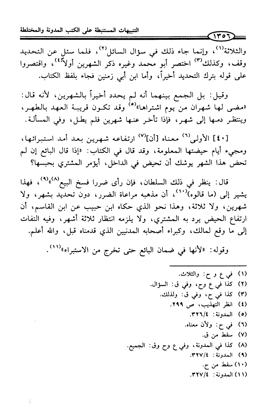 قال: ينظر في ذلك السلطان، فإن رأى ضررا فسخ البيع (¬8) " (¬9)، فهذا يشير إلى (ما قالوه) (¬10)، أن مذهبه مراعاة الضرر، دون تحديد بشهر، ولا شهرين، ولا ثلاثة، وهذا نحو الذي حكاه ابن حبيب عن ابن القاسم، أن ارتفاع الحيض يرد به المشتري، ولا يلزمه انتظار ثلاثة أشهر، وفيه التفات إلى ما وقع لمالك، وكبراء أصحابه المدنيين الذي قدمناه قبل، والله أعلم.